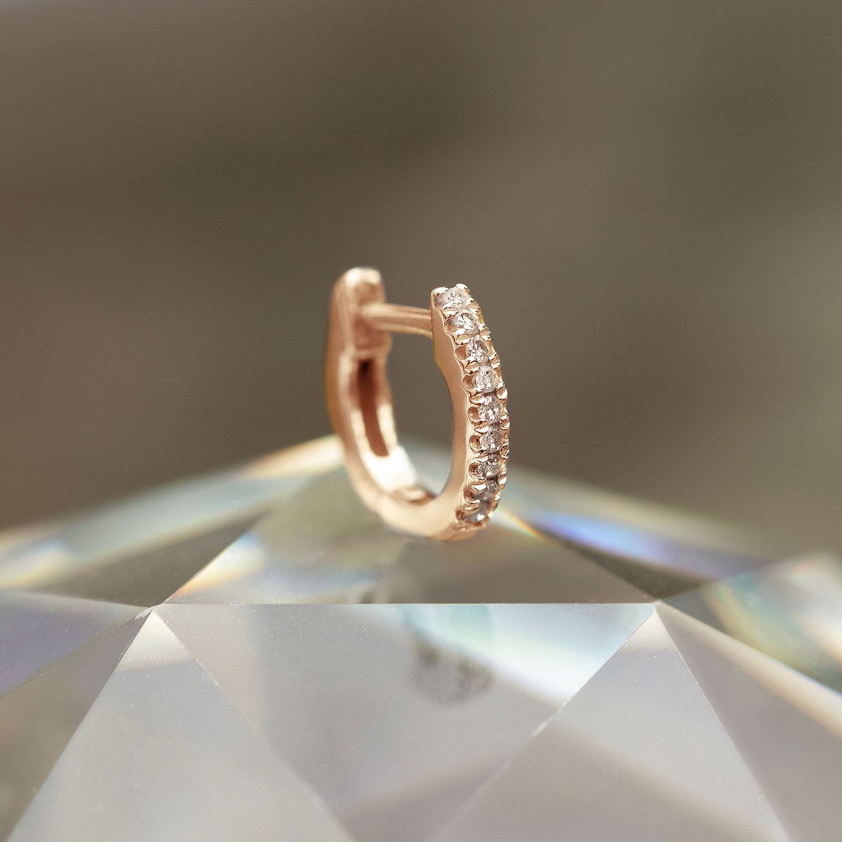 This 14K Solid Rose Gold small huggie is made with ethically sourced Real Diamonds. Notes: 5mm and 6mm are VERY TINY.Wear on upper-lobe, helix piercings.