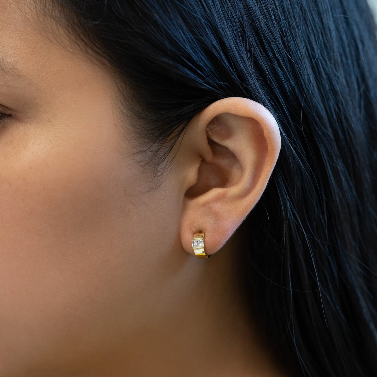 These bold huggie hoop earrings feature a wide band accented with a bar of trio baguette crystals in a polished channel setting for a sleek, modern look.