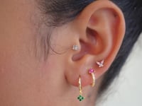 Gold huggie hoop earrings with a small emerald clover charm that hugs the ear perfectly. A delicate accent piece for stacking in your ear stack.