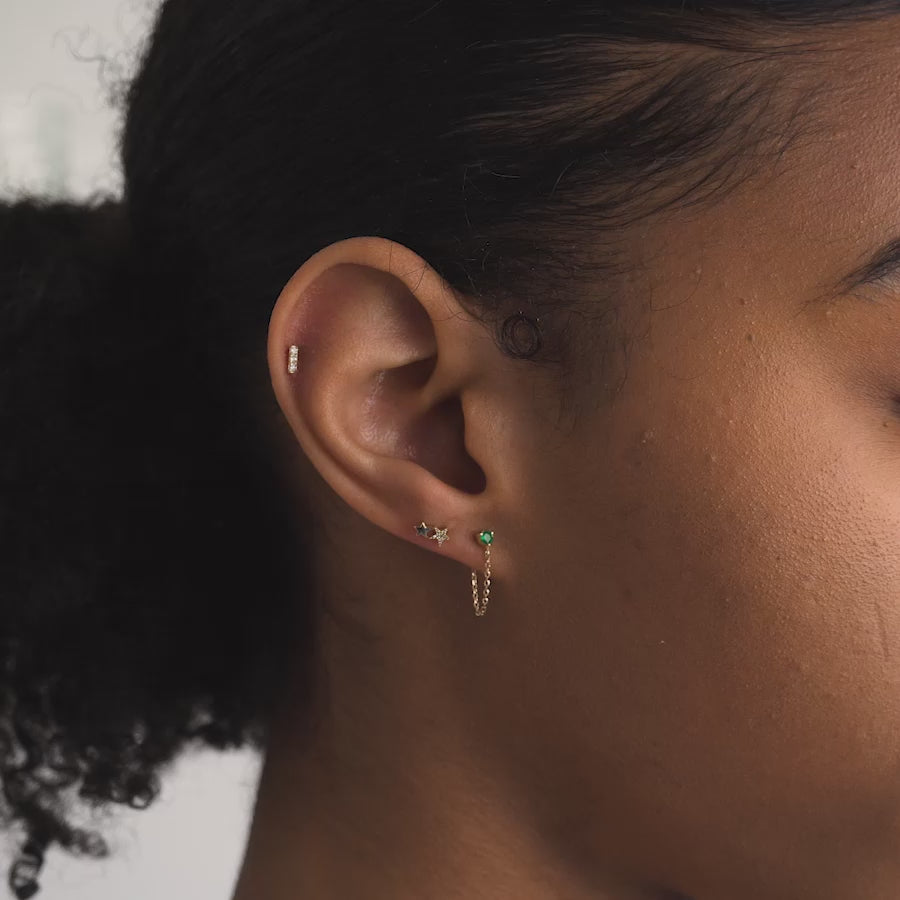 Tiny crystal bar single stud features a screw-on closure that is great for cartilage, upper lobe, helix, rook and daith piercings. Made from solid gold, this stud is perfect for the everyday, being waterproof and sweatproof!Wear on upper-lobe, helix piercings.