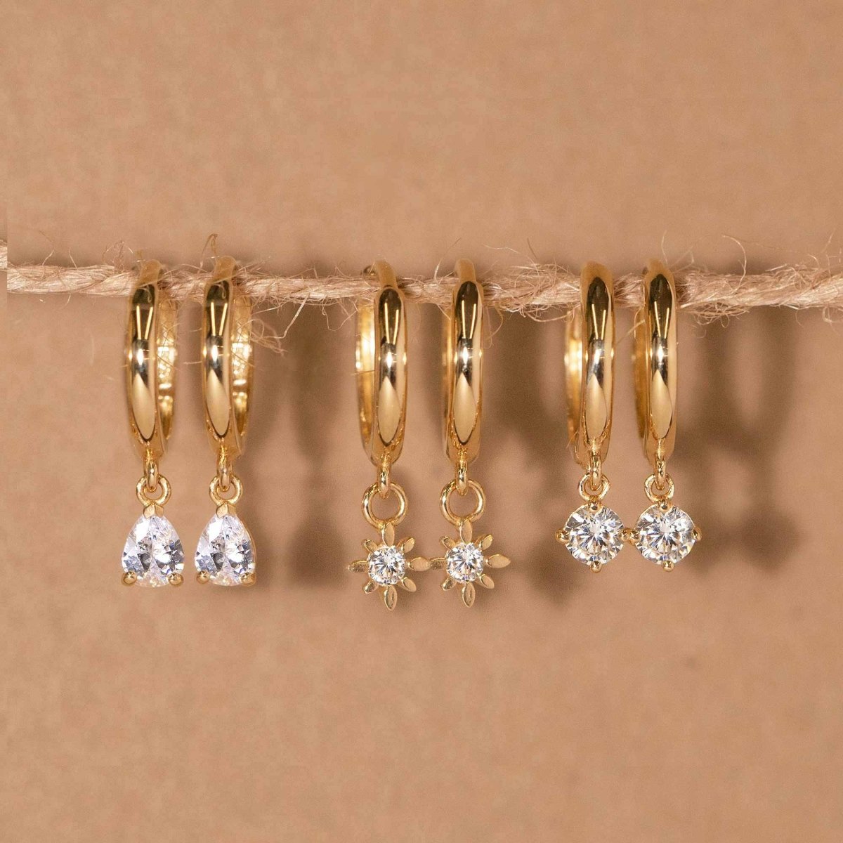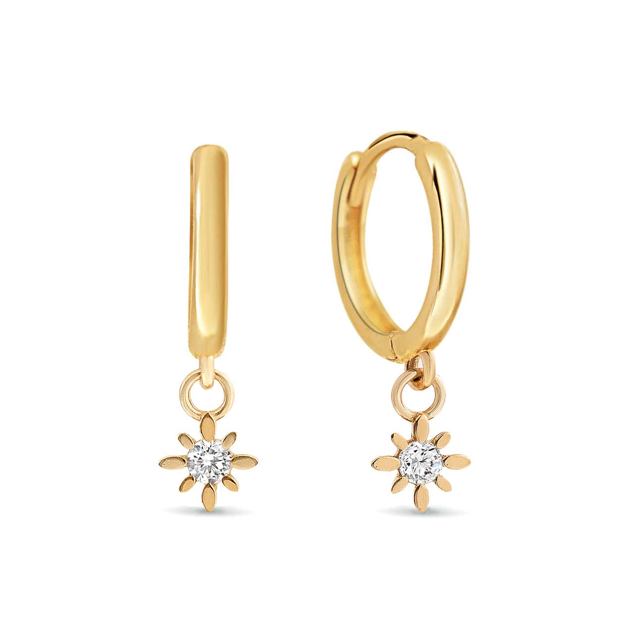 14K Gold huggie hoop earrings with a small Pave Starburst accent that hug your ear perfectly. Perfect to create your celestial ear stack