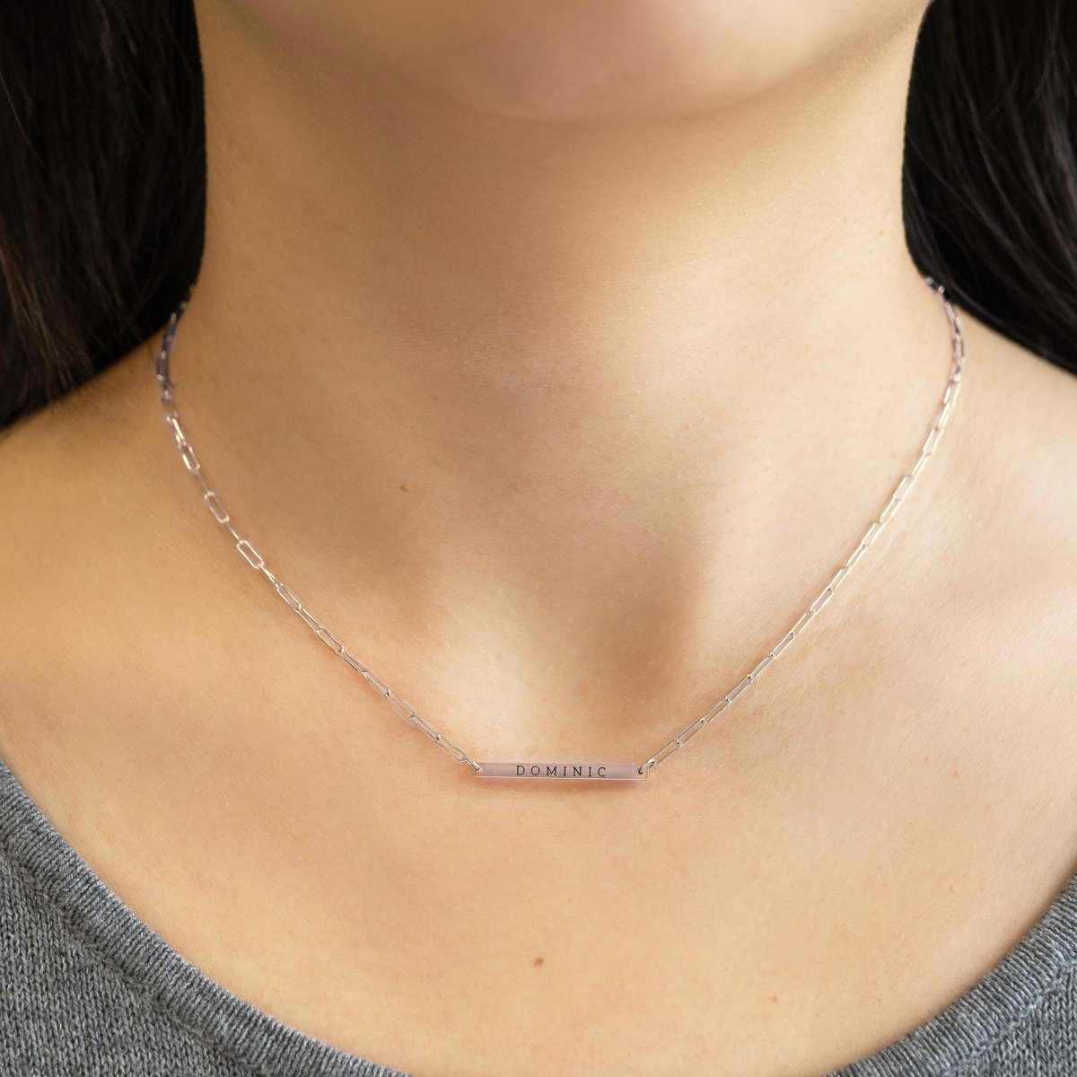 This custom name necklace features a sleek thin bar on a delicate silver paperclip chain, perfect for personalizing and gifting. Our O Collection patented connectors let you mix, match, or wear each separately.