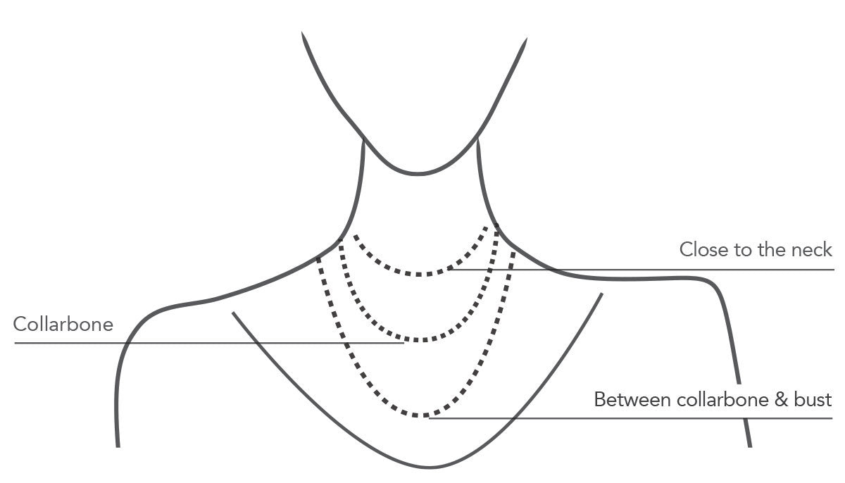 14 Lays close to the neck to the collarbone. Lays above the collarbone to below the collarbone.