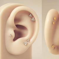 Tiny clover white zirconia gemstone flat back stud is set in 14K Solid Gold. Perfect for helix and upperlobe piercings. Wear on Upper Lobe, Helix, Conch, Tragus piercings.