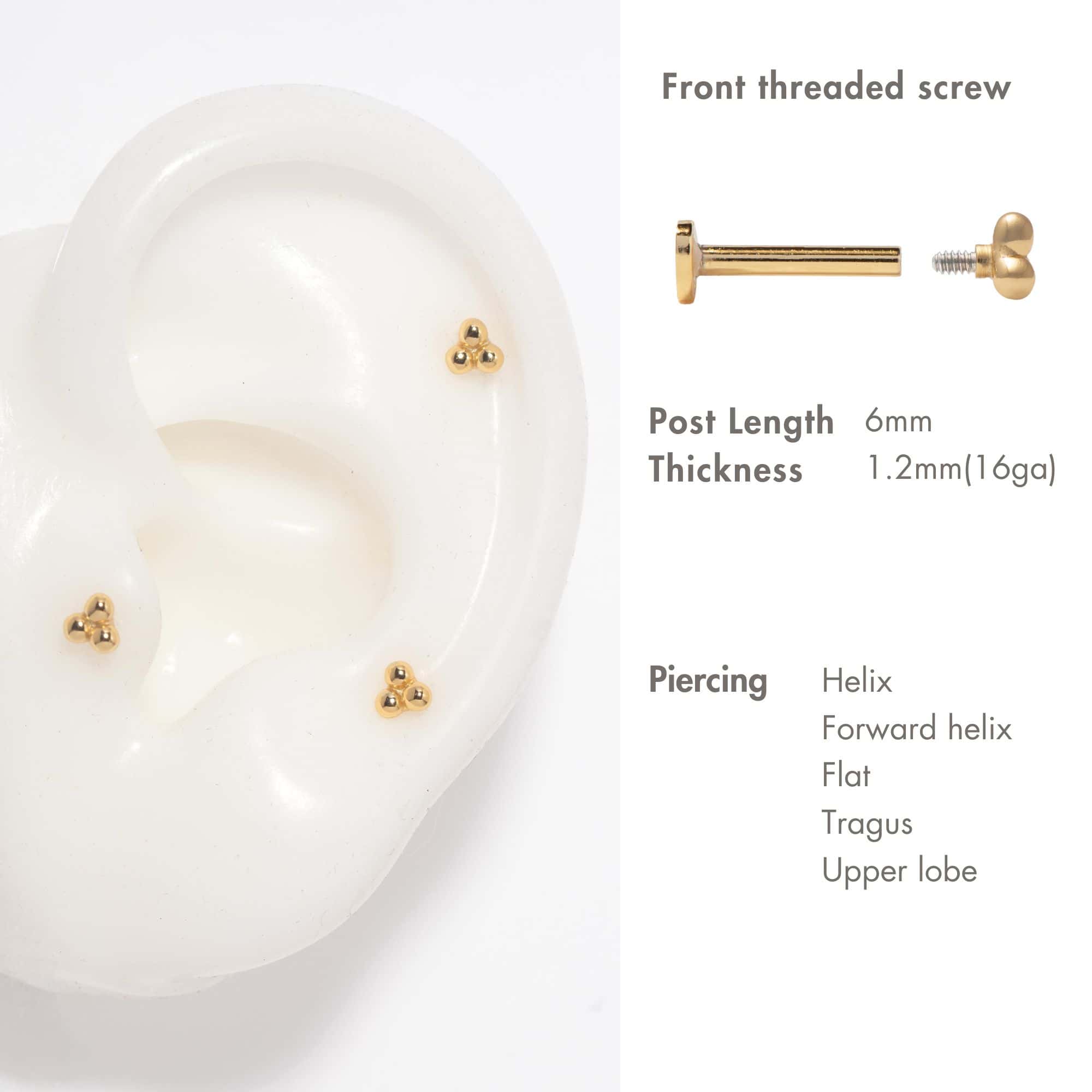 Tiny Trinity Ball Flat Back Stud Earring is the perfect for cartilage. Wear on upper-lobe, helix, conch piercings.