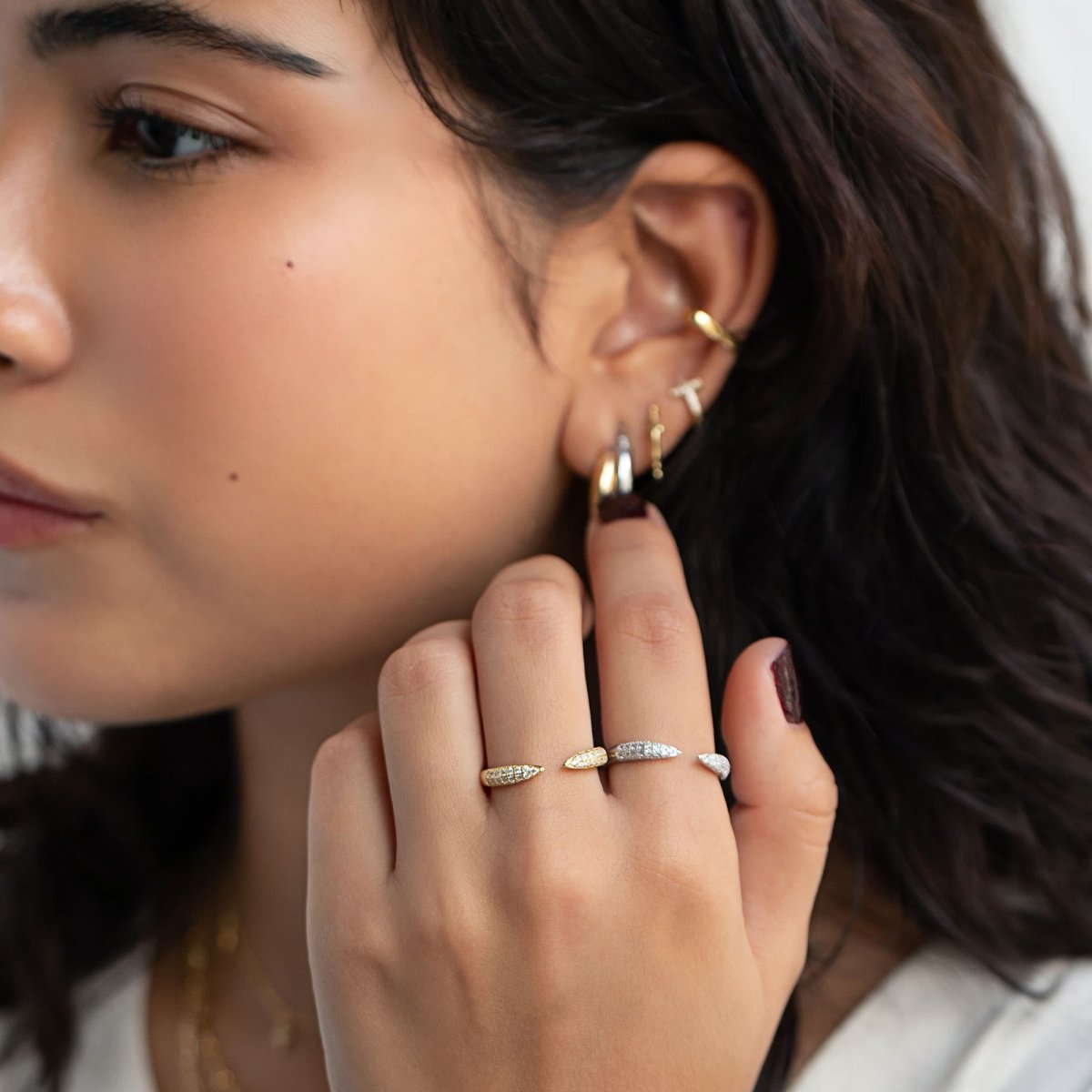 This silver open-ended claw ring features shimmering cubic zirconia along each tip for a modern, elegant look. Stack two or wear them side by side for a unique layered style.