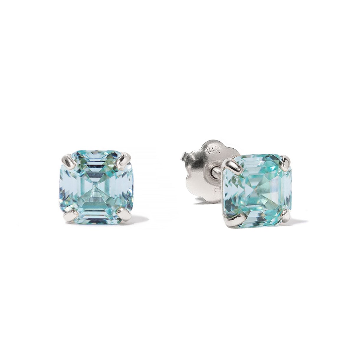 These classic and sparkly studs feature an Asscher cut Turquoise Paraiba gemstones set in 14K White Gold.
