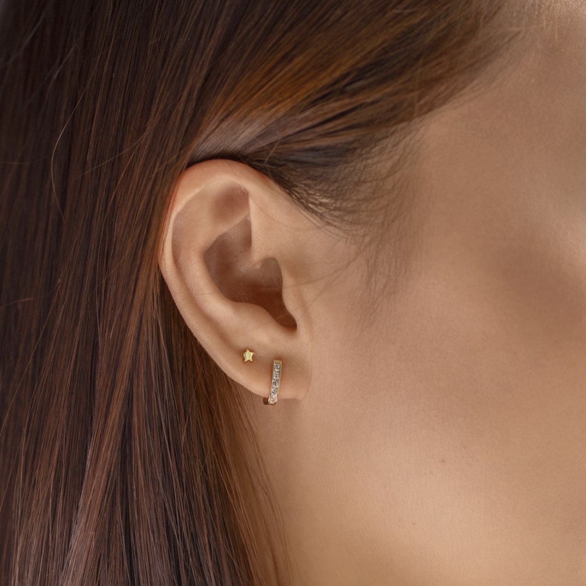 These 14K Gold huggies feature tiny White Zirconia gemstones. Great Birthstone gift!