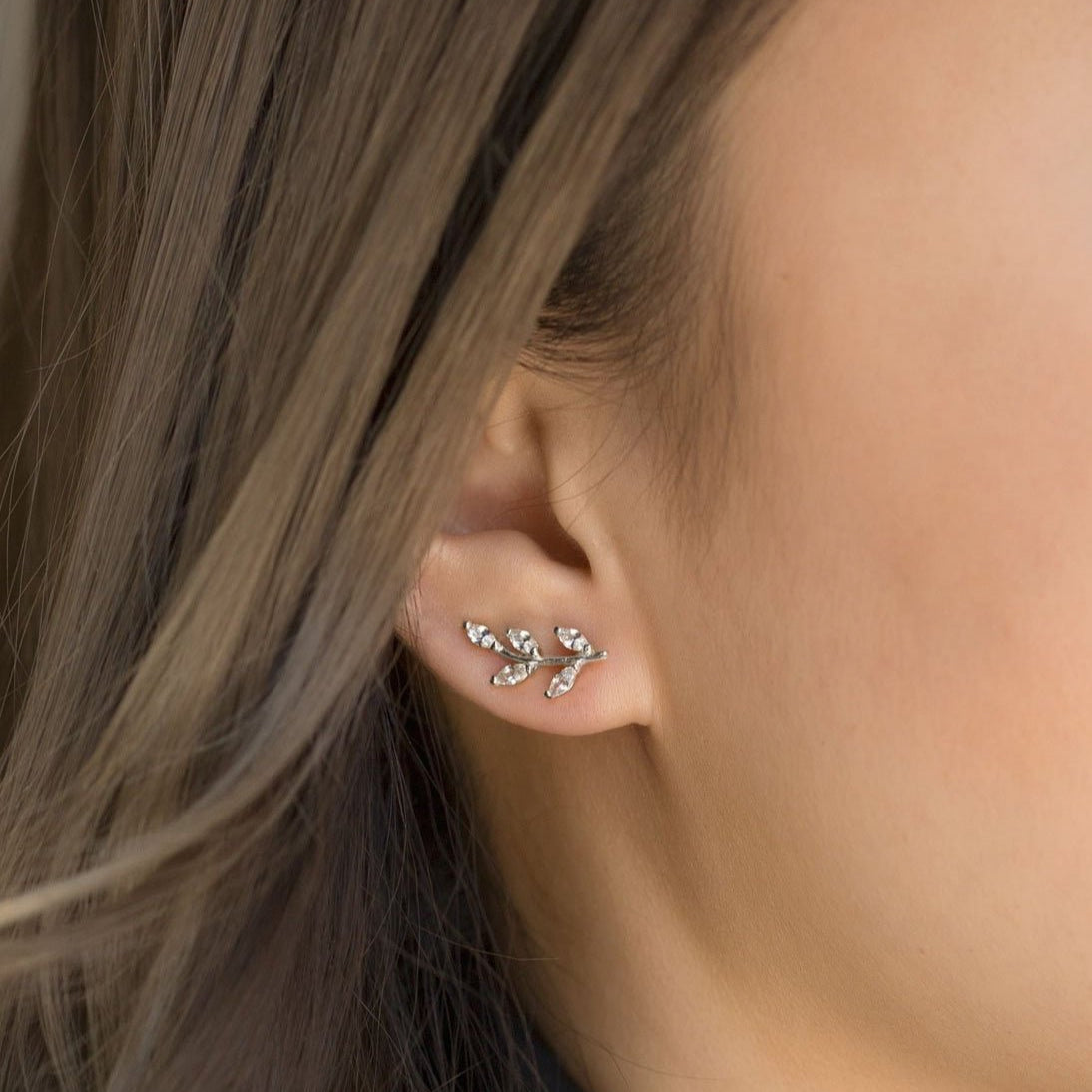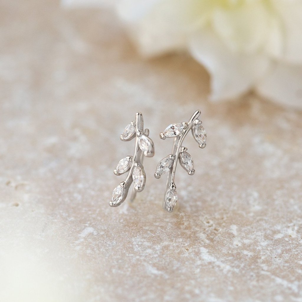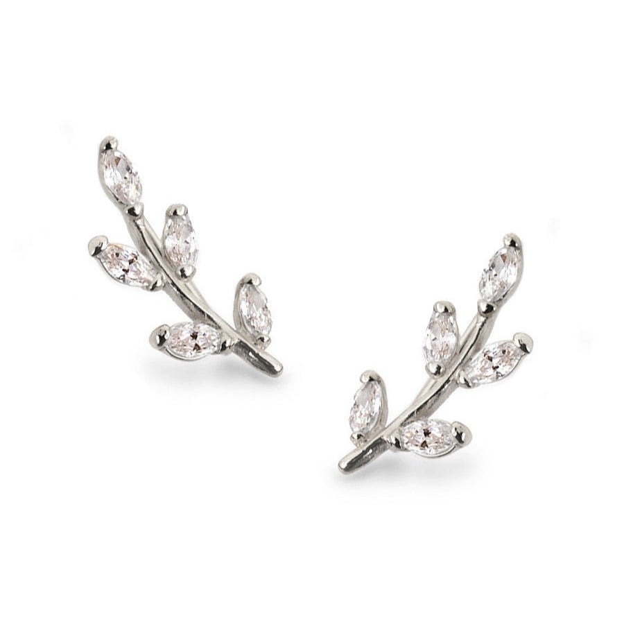 Silver crystal leaf ear climbers with pavé detailing, secured by a rear wire for comfort. Nature-inspired style that curves elegantly along the lobe.