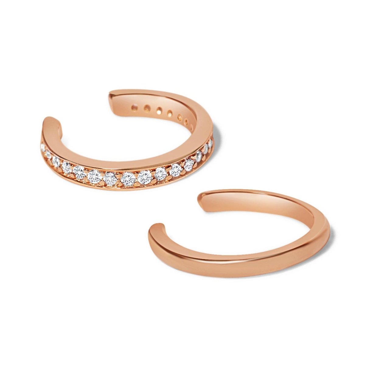 Classic rose gold ear cuff set featuring one pavé crystal cuff and one smooth band. Adjustable and fits all ear sizes, perfect for stacking without piercing.