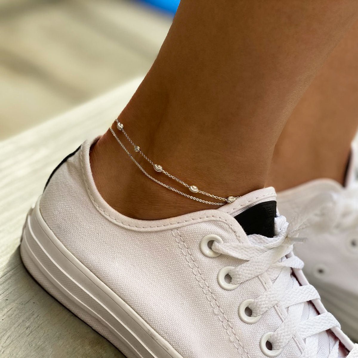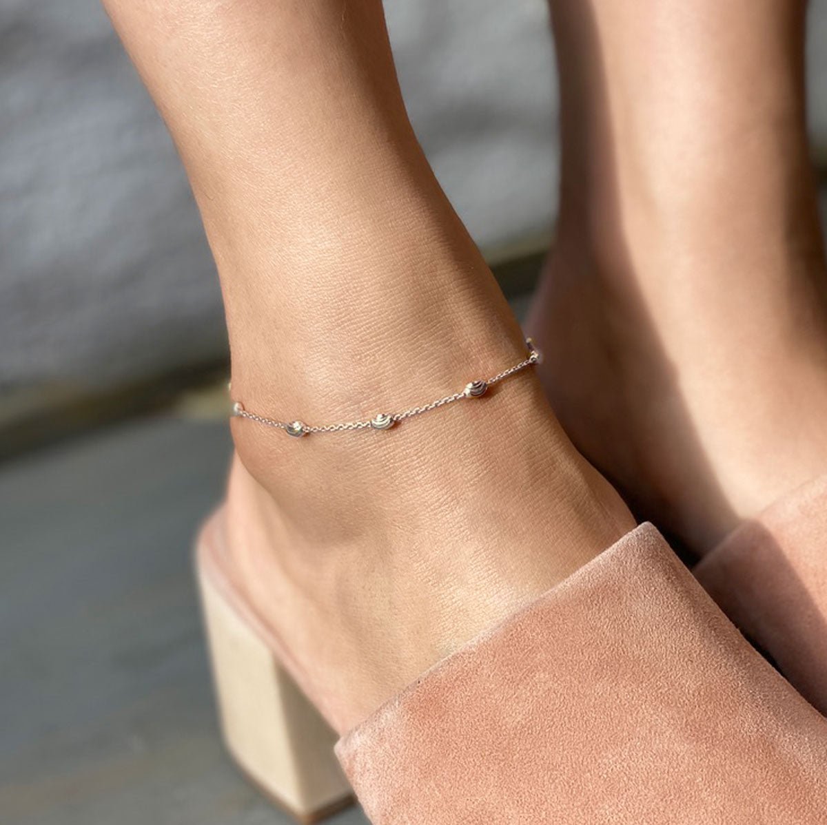 Add something sparkly to your ankle with this minimal anklet. Tiny Diamond cut beads on a delicate chain.