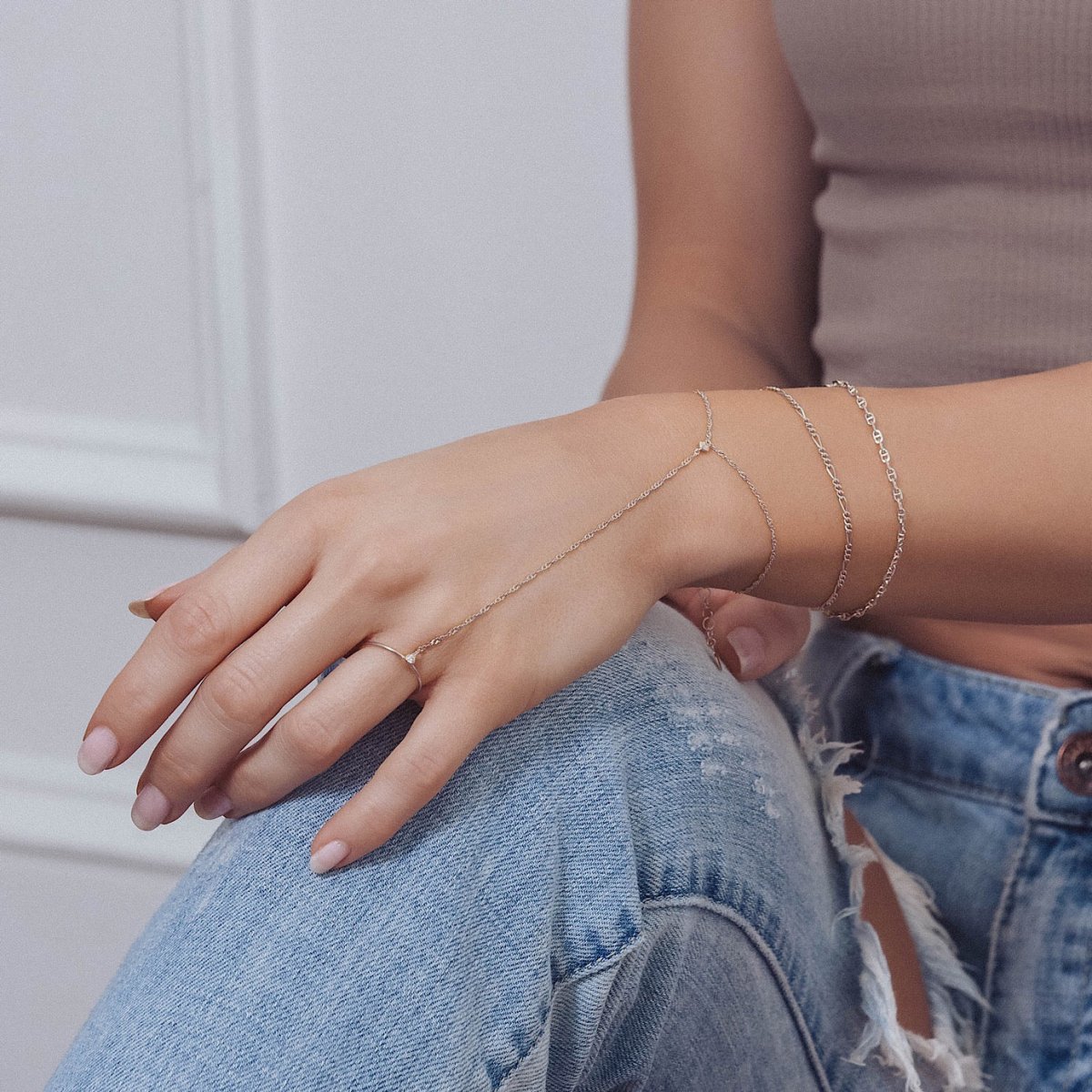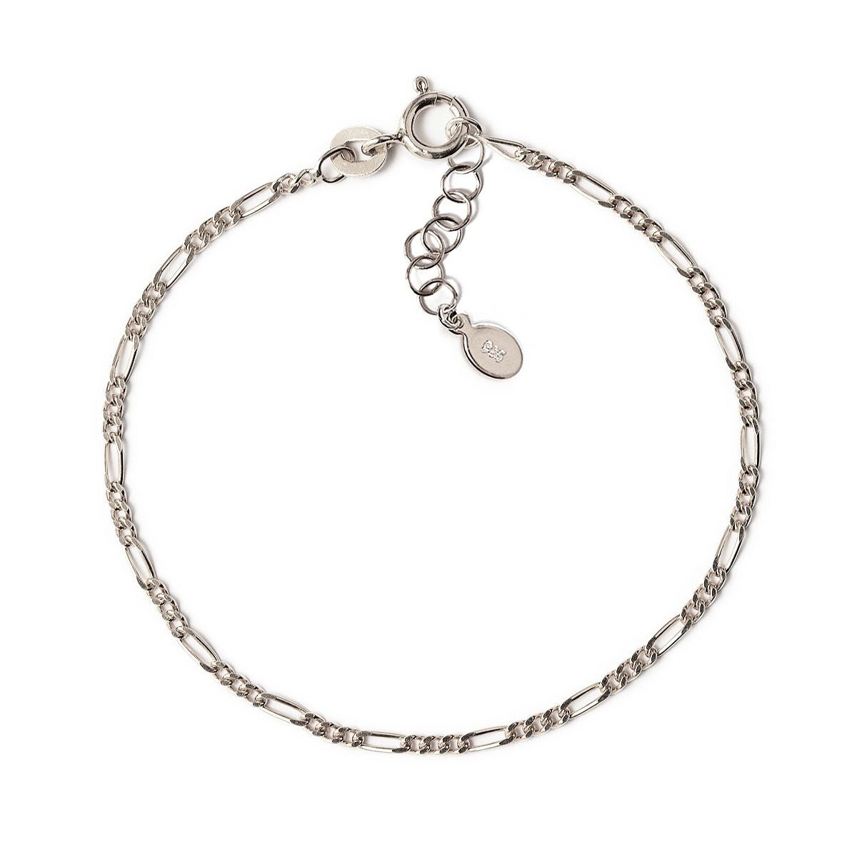 This dainty silver figaro chain bracelet features a classic pattern of three short links followed by one longer oval link. A timeless, intricate design to wear solo or layered.