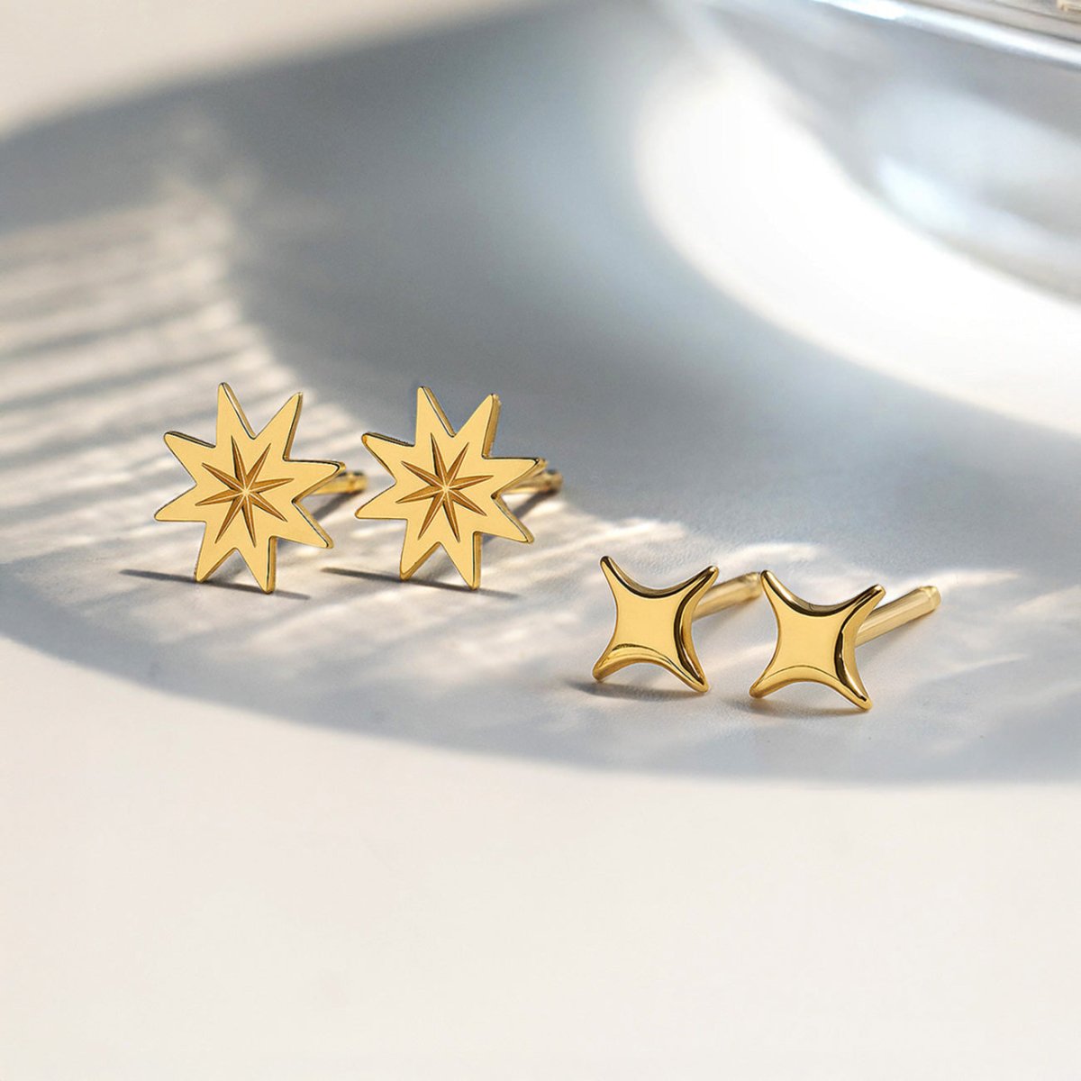 Tiny 14K Solid Gold flare star stud earrings are great for a second, third or helix piercing.
