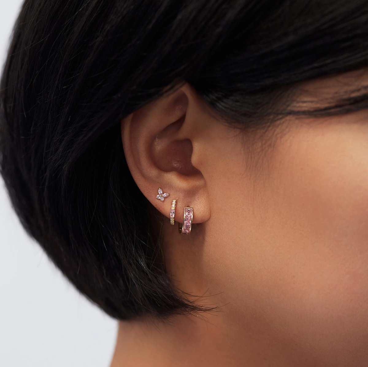 Minimal Pink Gold Huggie Hoop earrings that hug your ear perfectly. Pink Baguette: and Pave crystals give an extra sparkle to a classic shape. Perfect to gift for October birthdays.