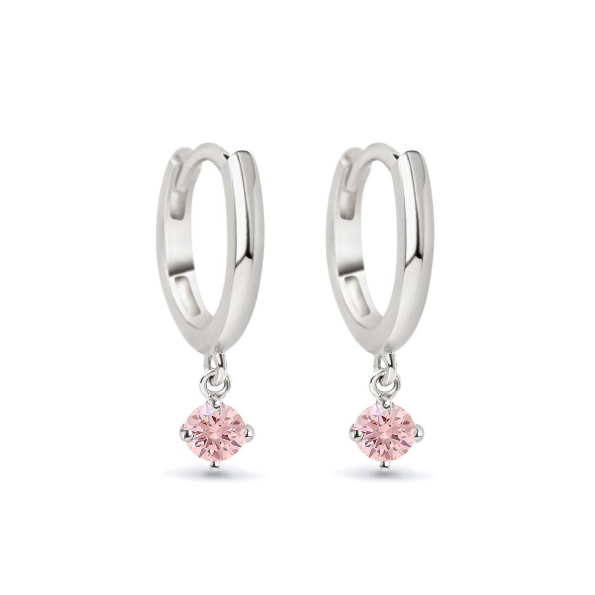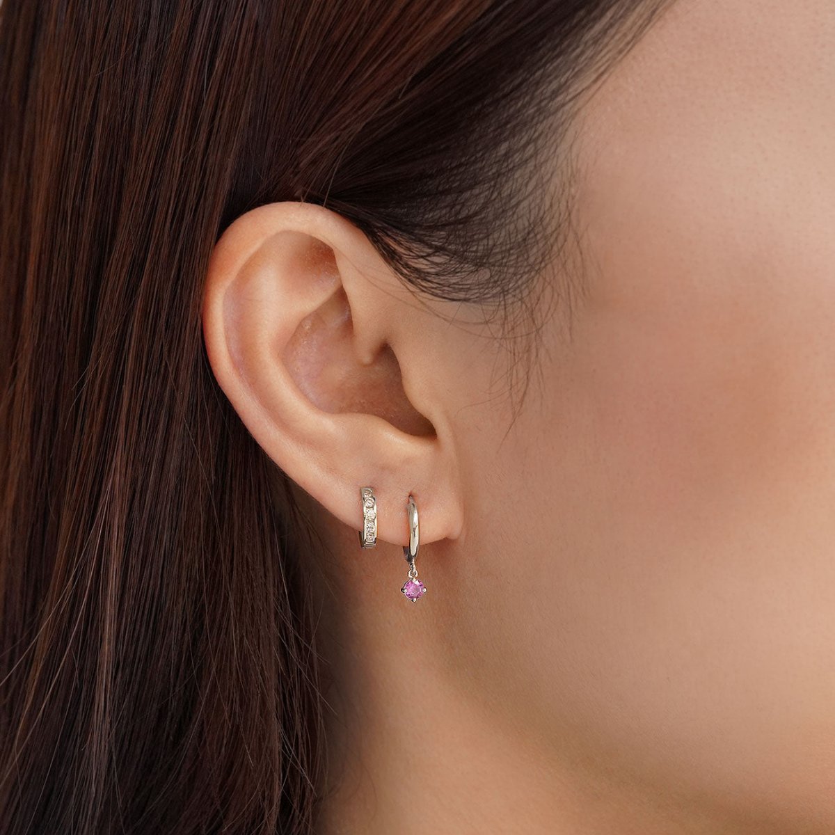 These 14K White Gold Gold small hoop earrings feature tiny Pink Sapphire gemstones. Great Birthstone gift! Gold makes them pair tarnish-free!