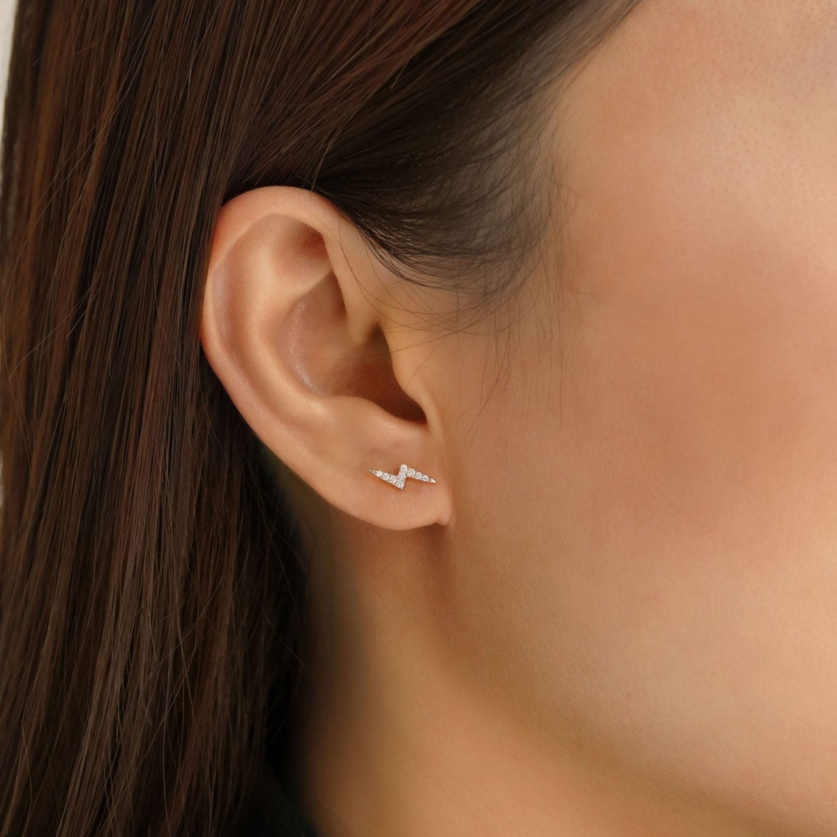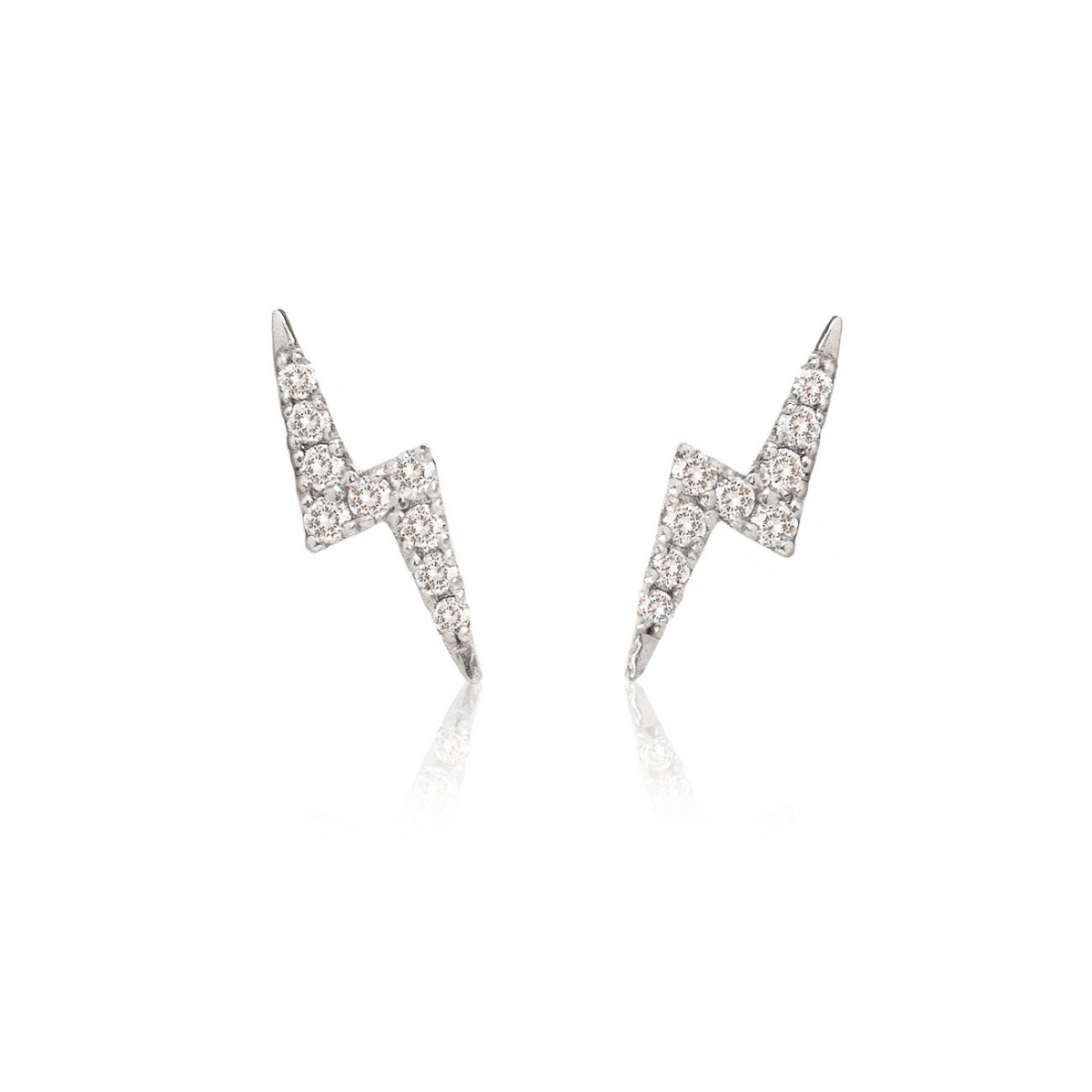 White gold lightning bolt earrings studs with tiny pavé crystals for a dazzling shine. A bold and playful accent for any ear stack.