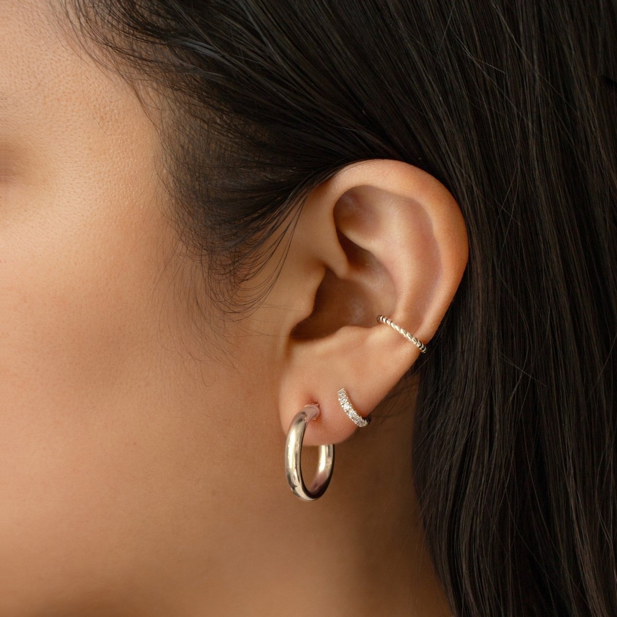 Thick classic Sterling Silver hoops that are light-weight and perfect to wear for your everyday look. These hoops are a staple piece that can easily stack with other huggies. The latch feature makes it easy to put on and take off. Great to pair with smaller Huggies.