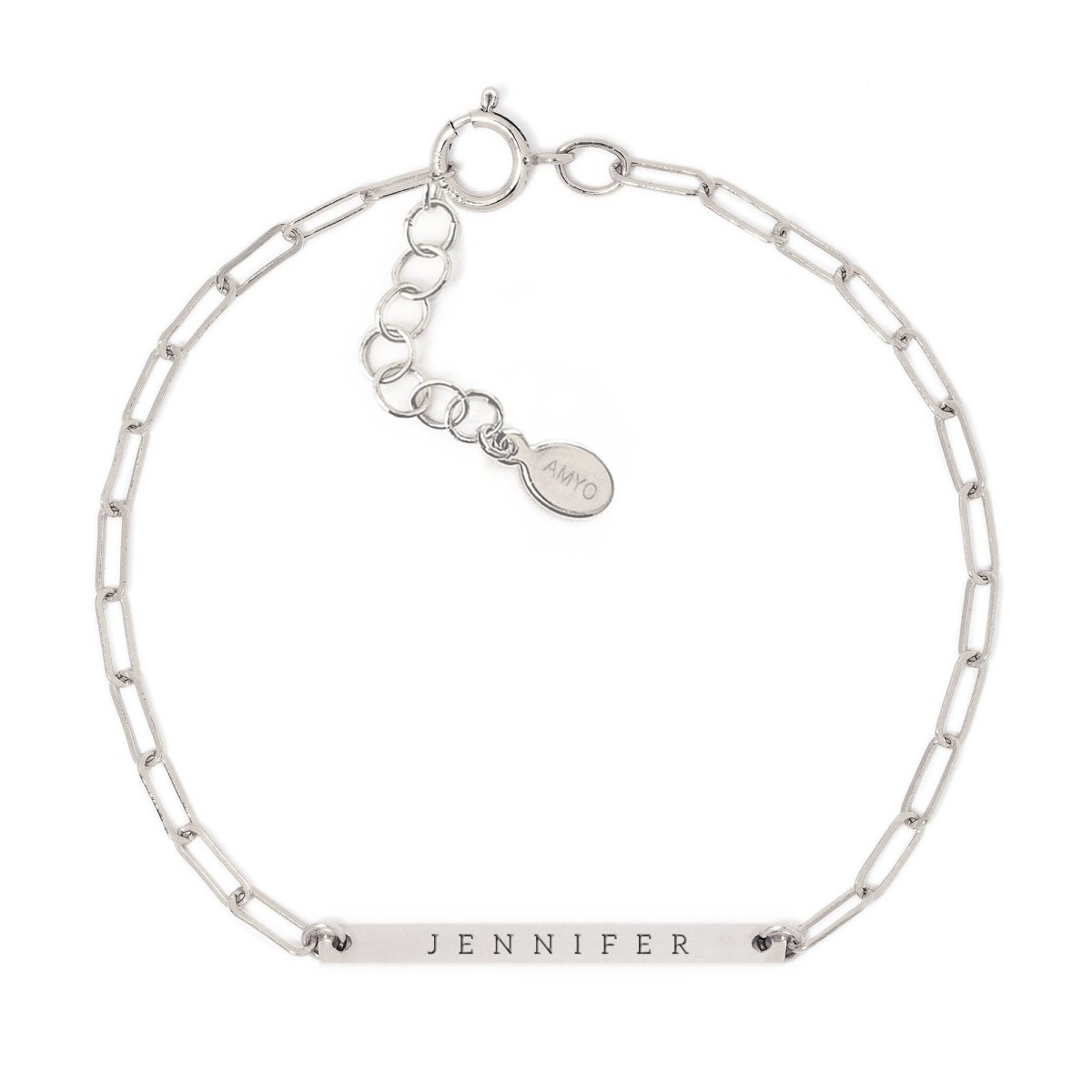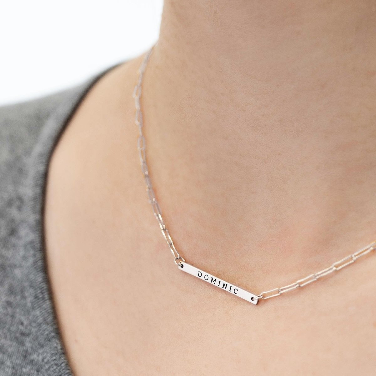This custom name necklace features a sleek thin bar on a delicate silver paperclip chain, perfect for personalizing and gifting. Our O Collection patented connectors let you mix, match, or wear each separately.