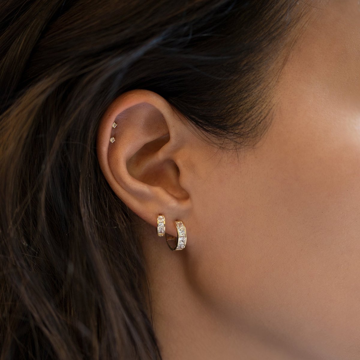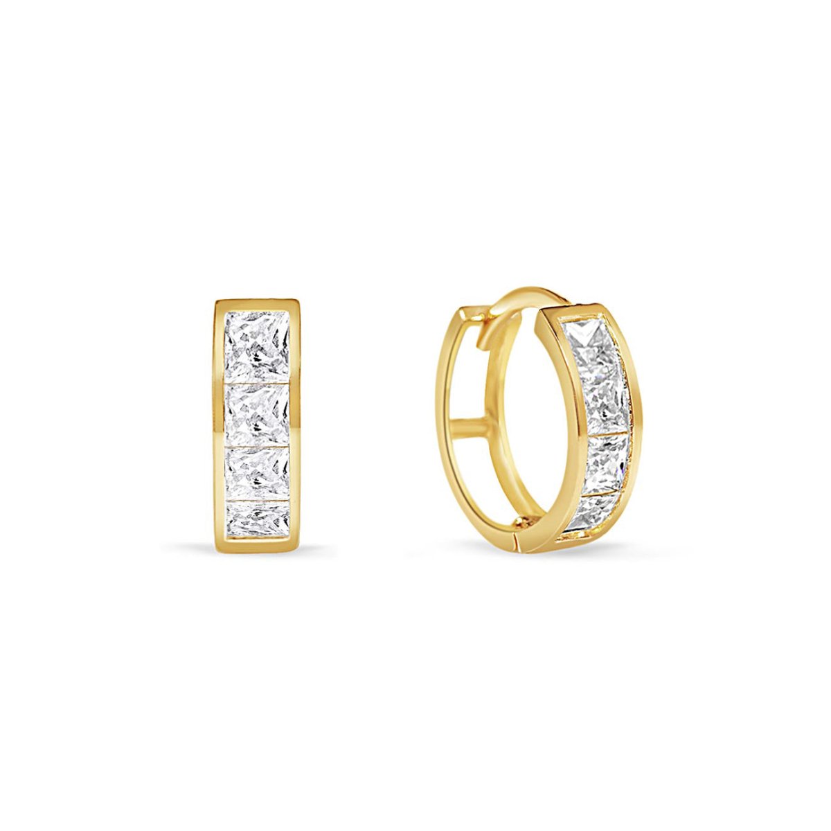 These 14K Gold Huggies feature Princess-cut stones in channel setting. Channel settings are great because they are snag-proof.