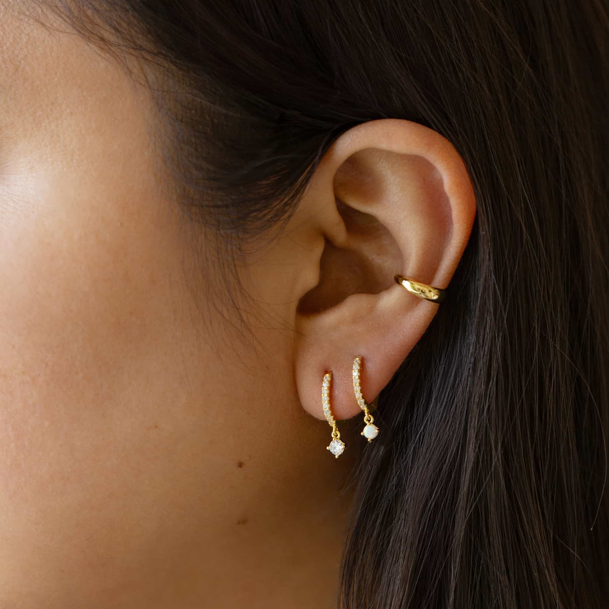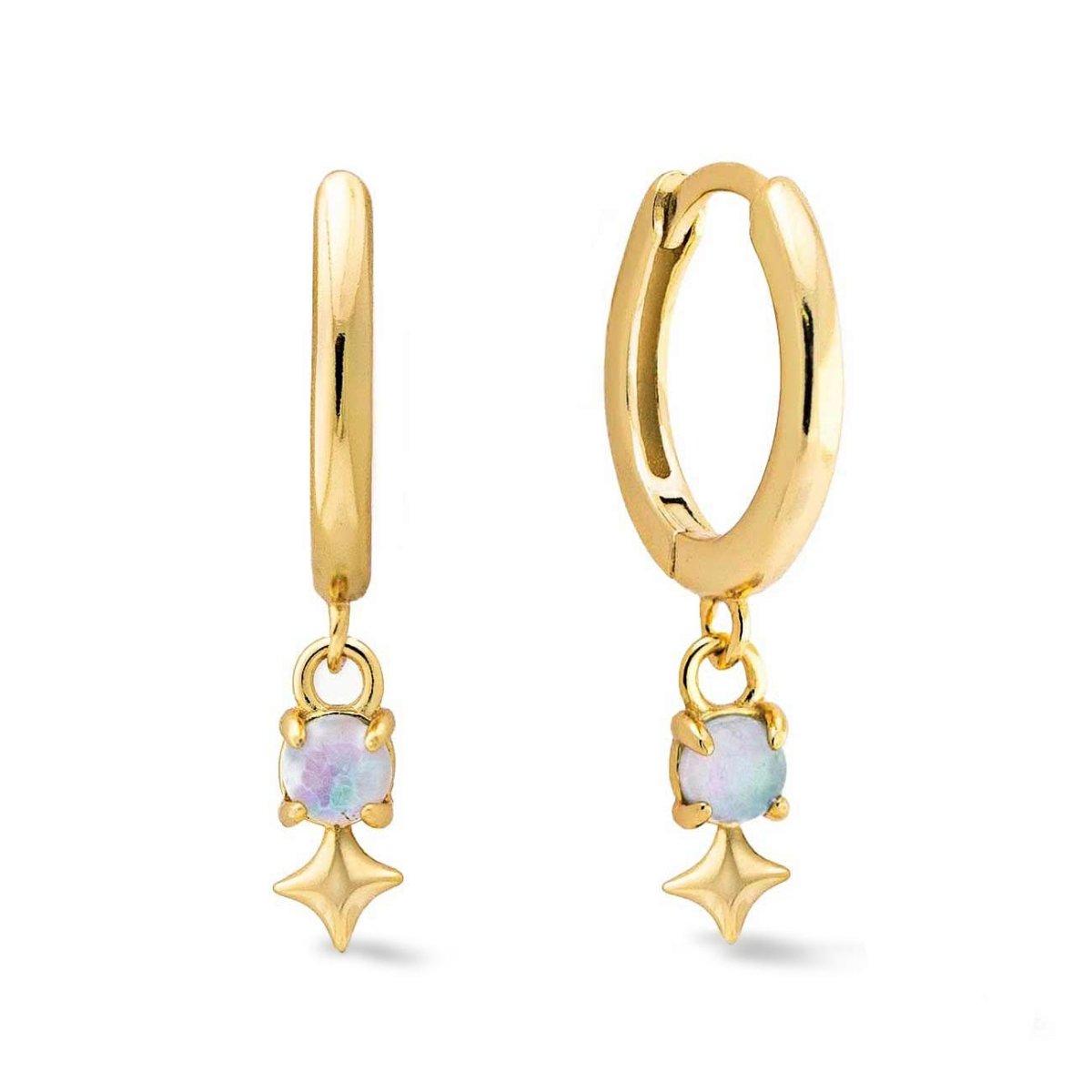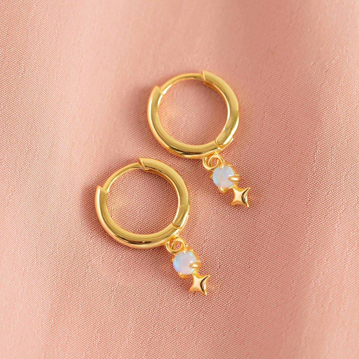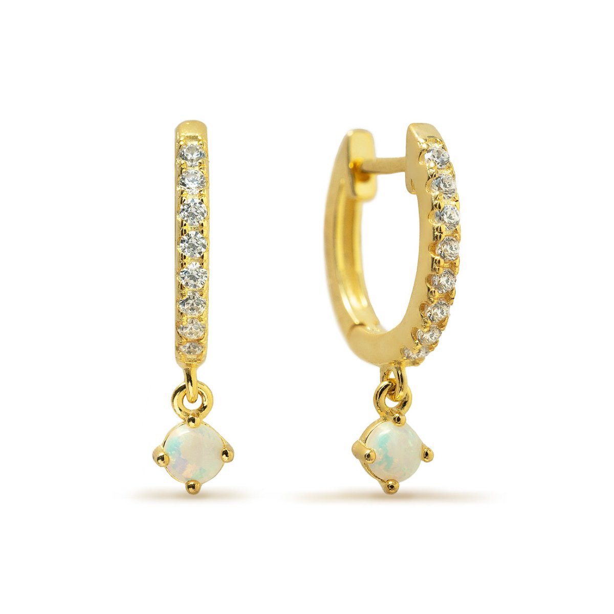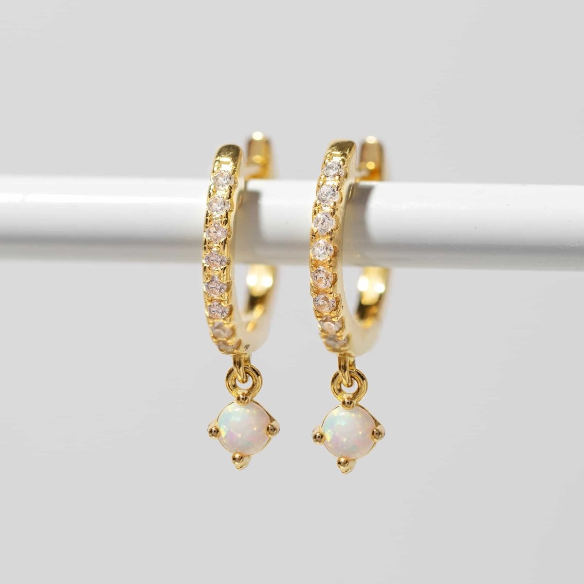 These huggies feature tiny dangling opal gemstones. Making it a great Birthstone gift!