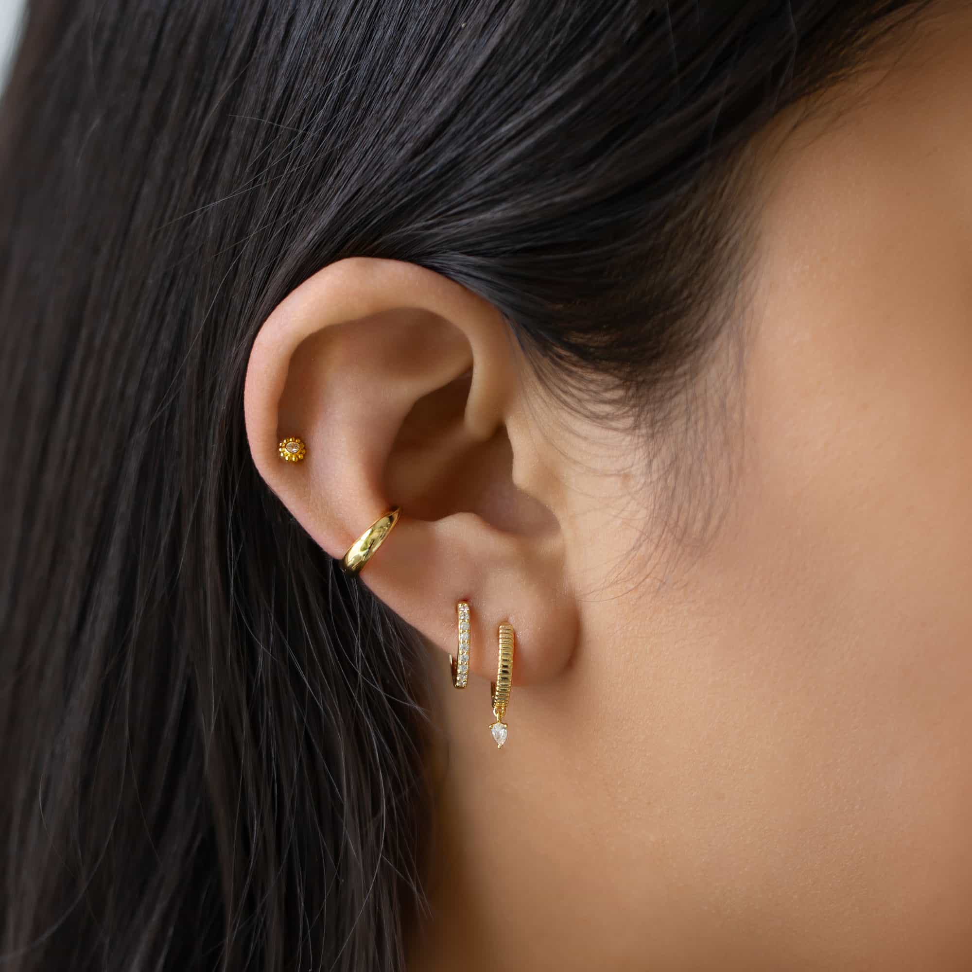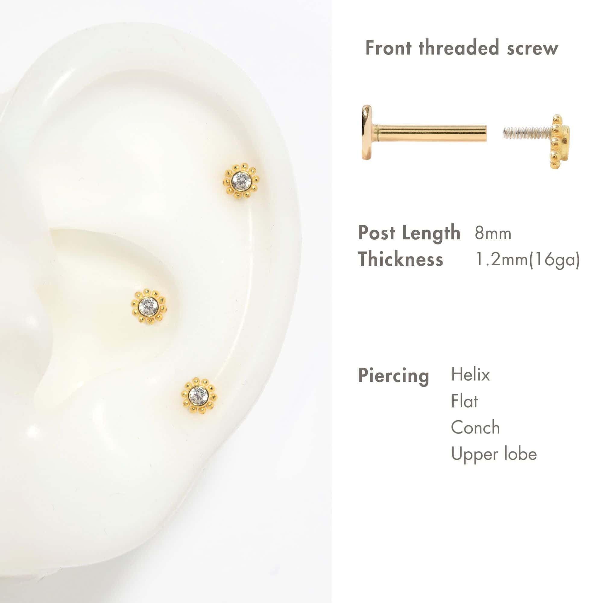 This tiny beaded halo flat back single stud features a front threaded screw-on closure. Worn on helix, flat, conch and upper lobe piercings.Wear on upper-lobe, helix, conch, labret-lip piercings.