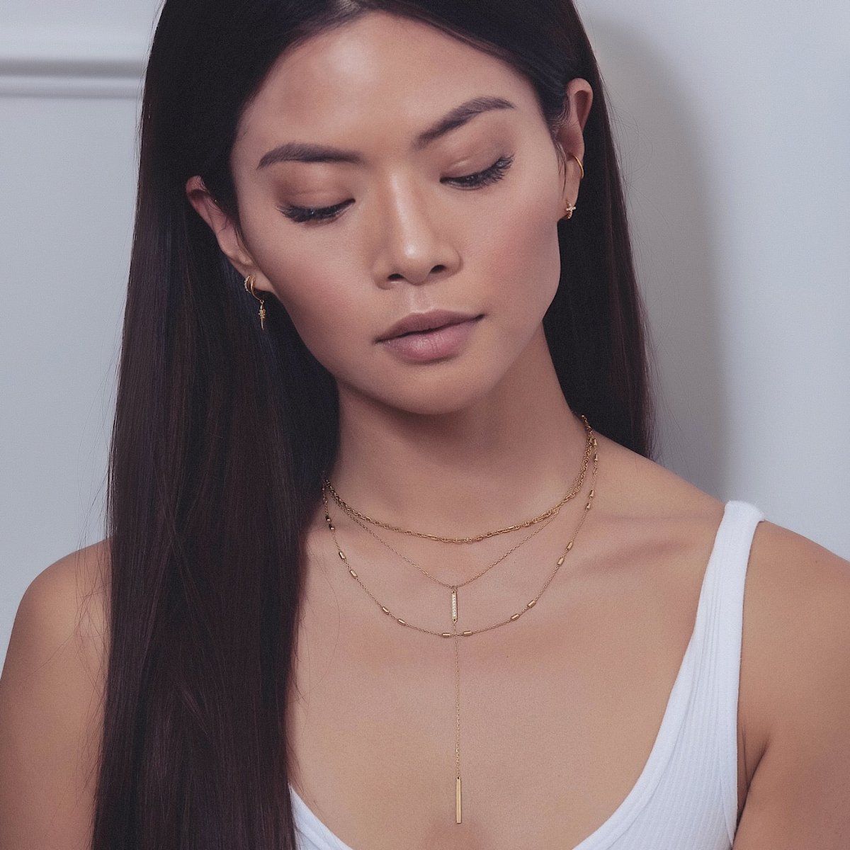 Gold layering lariat necklace featuring a minimalist bar on a diamond-cut cable chain. Our O Collection patented connectors let you mix, match, or wear each separately.