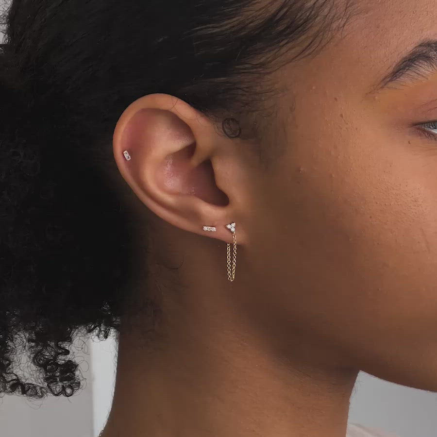 Solid gold Diamond clover studs ethically sourced and set on a chic front-to-back chain. Beautifully crafted and finished with sparkling pave settings.
