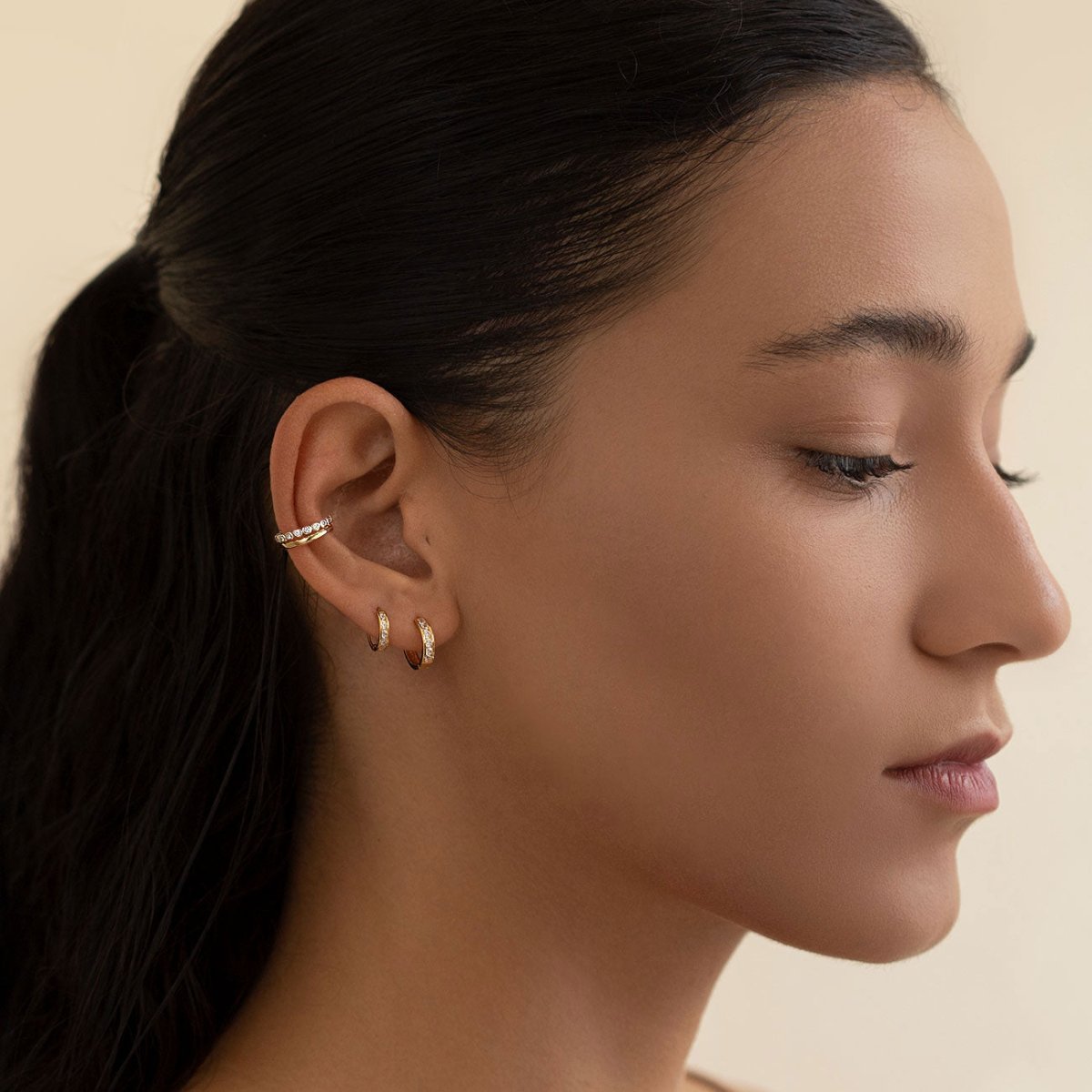 This 14K Gold Huggie Hoop will be your favorite everyday earring. Good thing because these will never tarnish! Our Pave Huggies are true to size and will hug your ear perfectly. Our 6.5mm is great for smaller lobes or second piercings.Wear on upper-lobe, helix piercings.