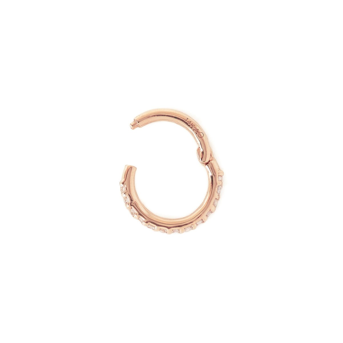 This slim pave 14K rose gold cartilage hoop earring adds subtle sparkle and features a secure seamless hinge. Perfect for helix, tragus, rook, or labret piercings.