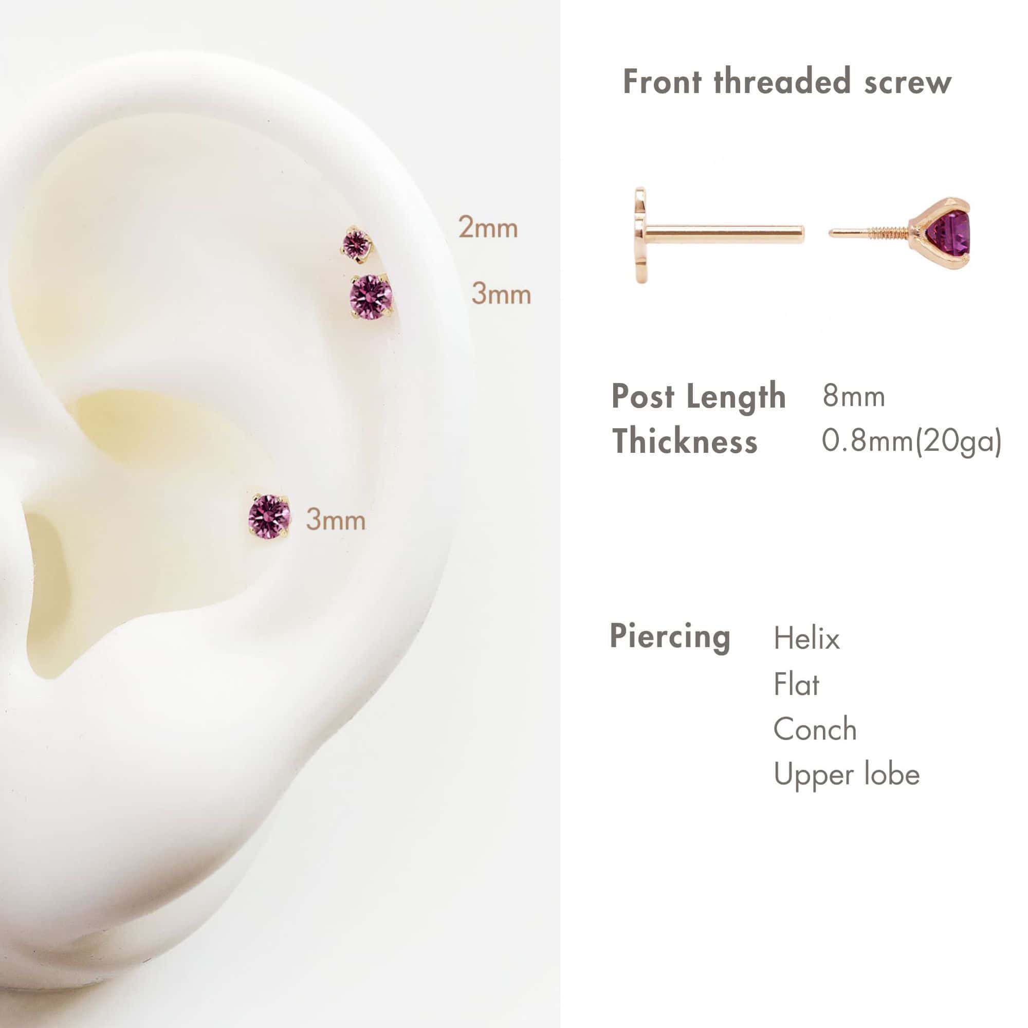 Tiny 14K Gold Ruby gemstone flat back stud features a front threaded screw-on closure. Worn on helix, tragus, cartilage and upper lobe piercings.Wear on upper-lobe, helix, conch piercings.
