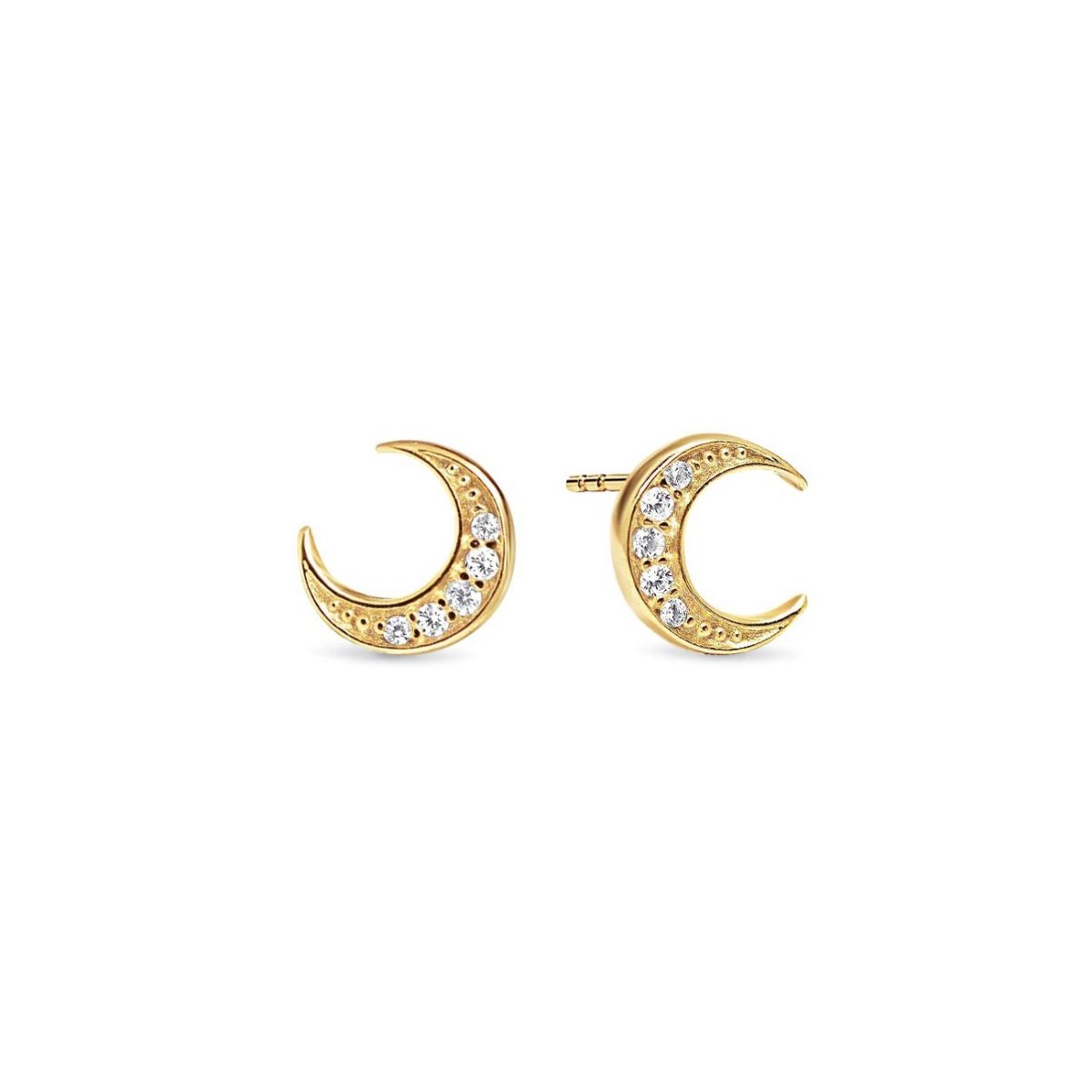 Adorable crescent moon small gold stud earrings with cubic zirconia crystals. Lightweight and versatile, perfect to dress up or down for any occasion.