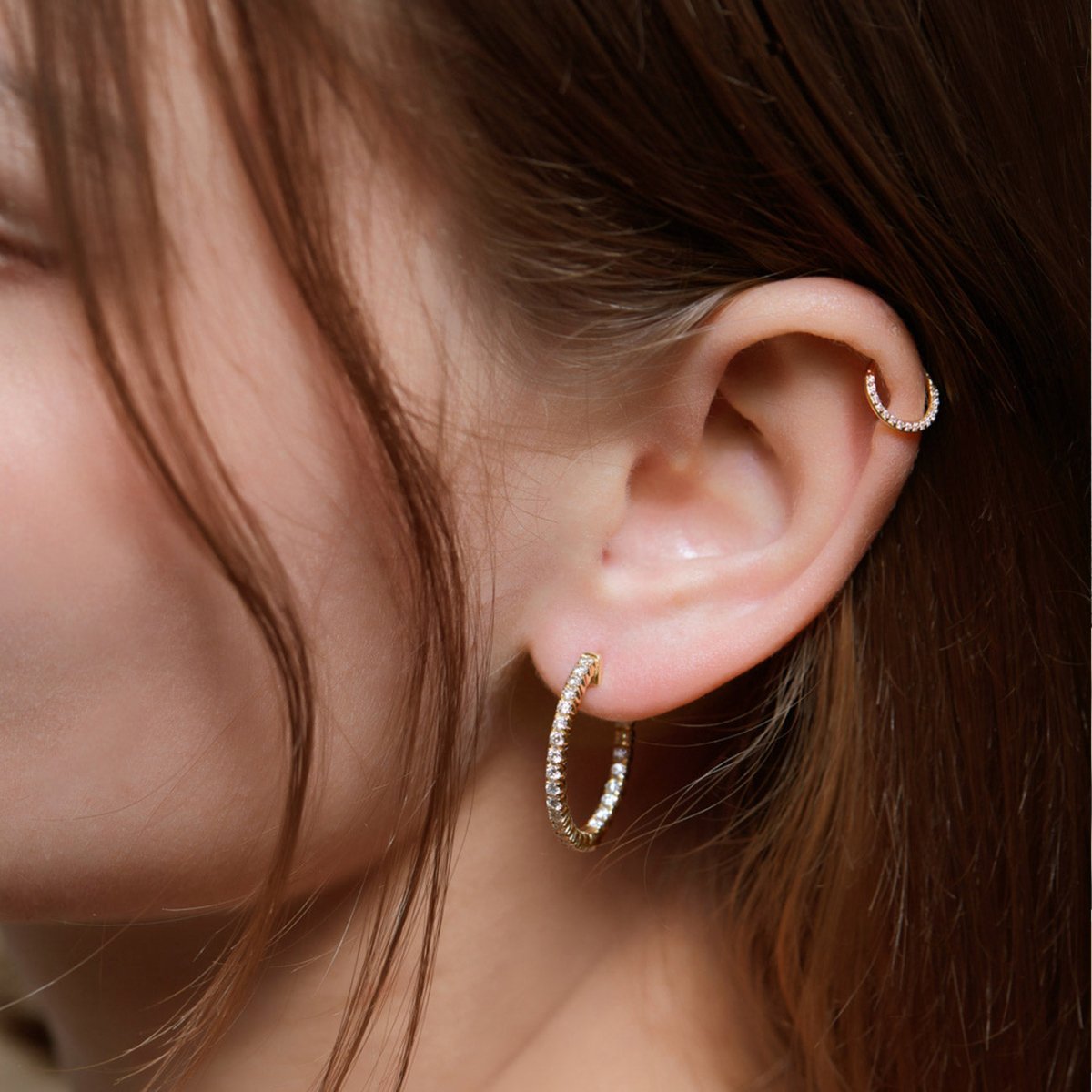 Solid gold pavé front-facing clicker hoop designed for tragus, rook, daith, helix, septum, or nose piercings. Secure and versatile for everyday wear.
