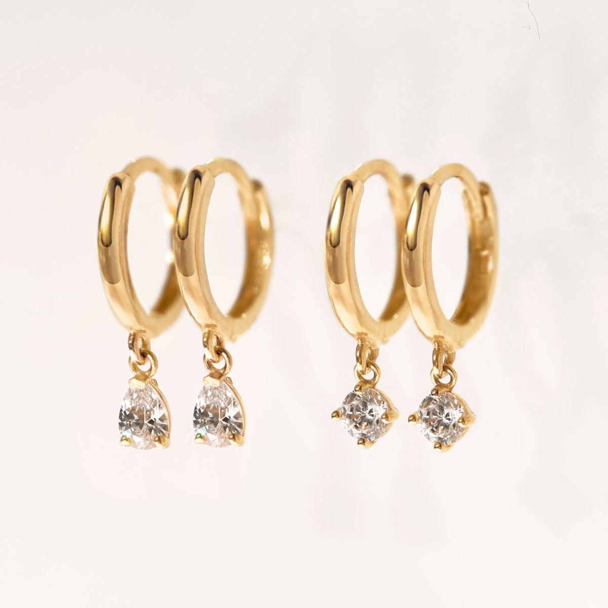 These 14K Gold Small Hoop earrings feature a tiny dangling Pear Crystal with prong setting. With just the right amount of sparkle these go great with other huggies in our 14K Gold Collection.