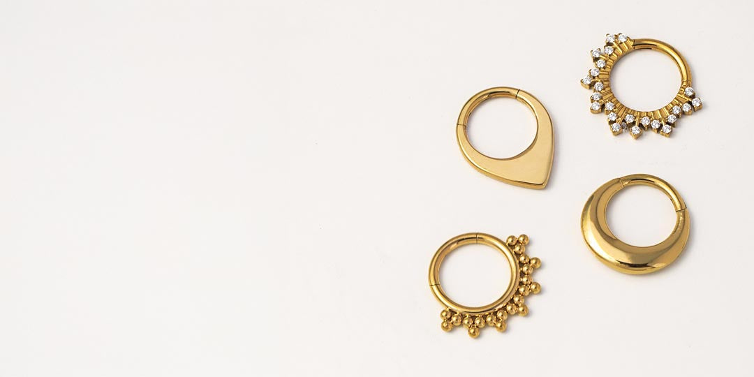 A pavé twist on our signature beaded hoop. Set with white zirconia in gold titanium, this half-clicker adds sparkle to helix or septum piercings. Wear on Upper Lobe, Septum, Daith piercings.