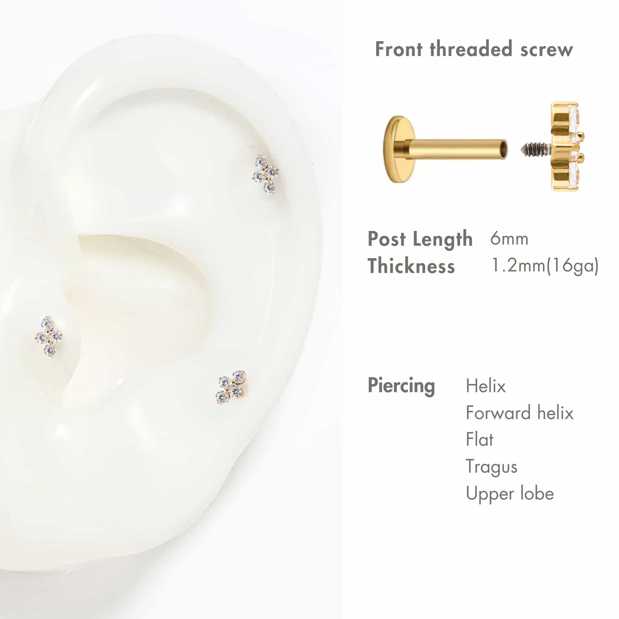 Our labret flat back front threaded Tiny Four Crystal Single Stud is made in Gold PVD Titanium. Great for Cartilage, Tragus and Upper lobe piercings. Wear on upper-lobe, helix, conch, tragus piercings.