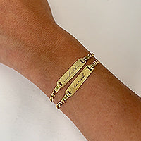 This gold engravable cuban link bracelet features a sleek bar detail. Timeless and versatile, it makes a perfect gift. Can be worn solo or layered.