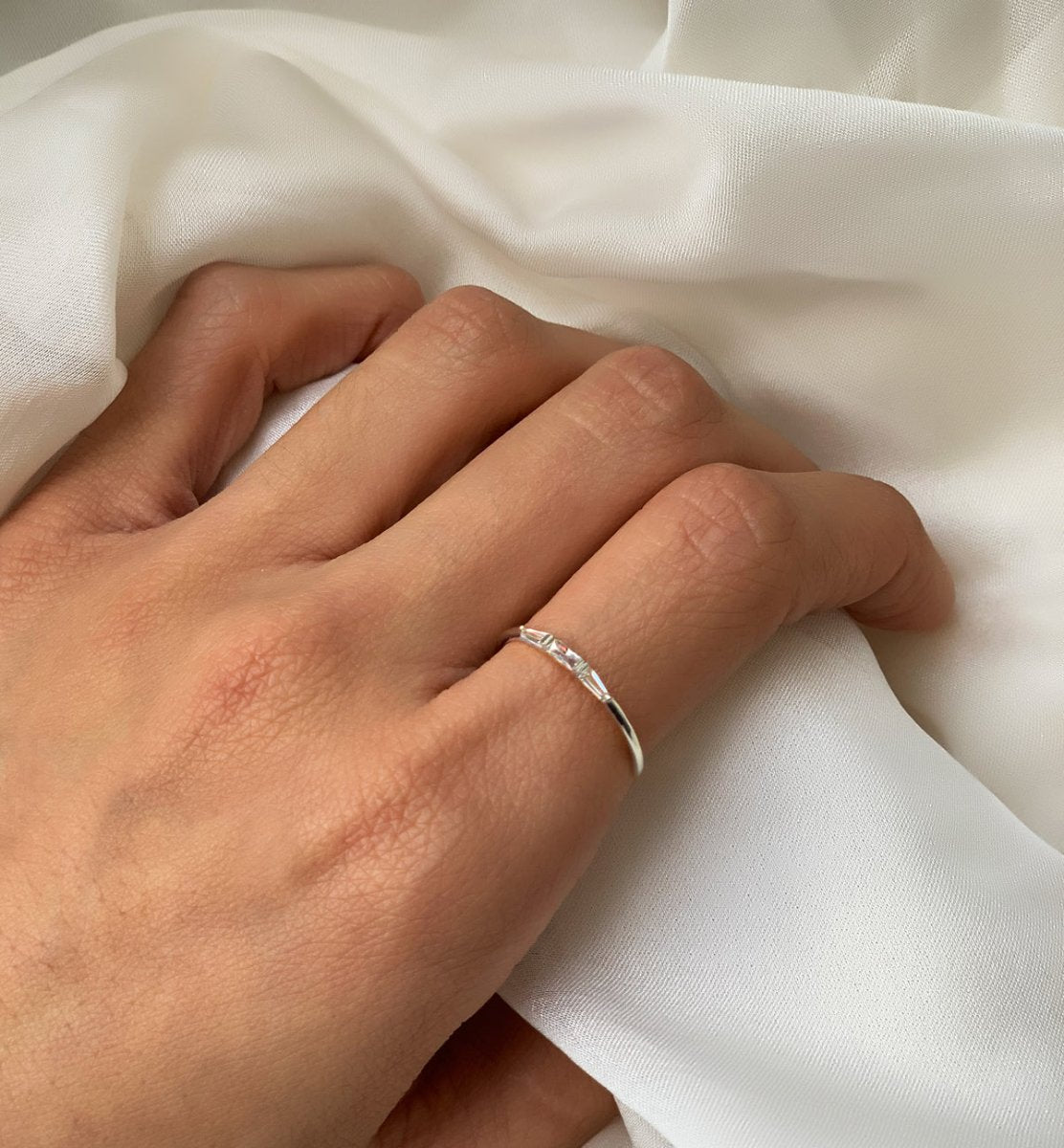 Minimal and dainty, perfect to wear alone or stack with other delicate rings. The blend of Baguette and tapered Baguette crystals make this a beautiful combo.