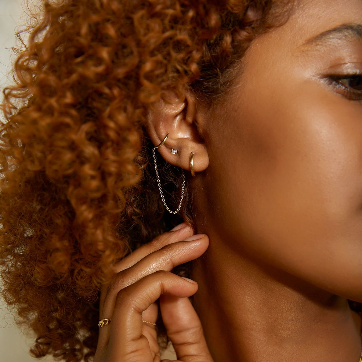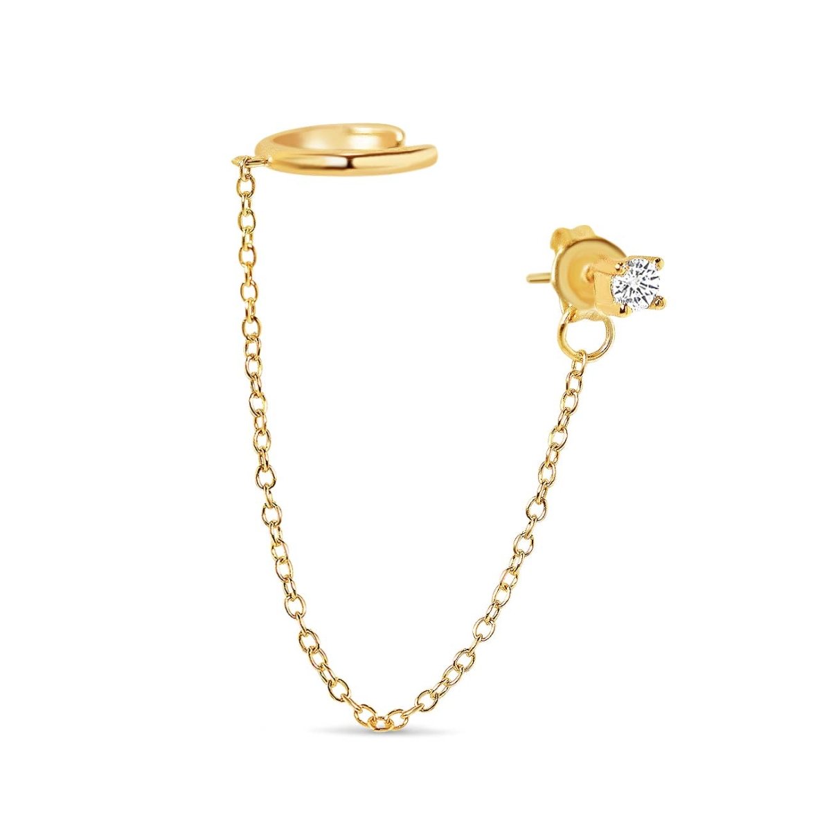 A unique ear cuff that features a chain and connected stud earring. Adjustable sizing.