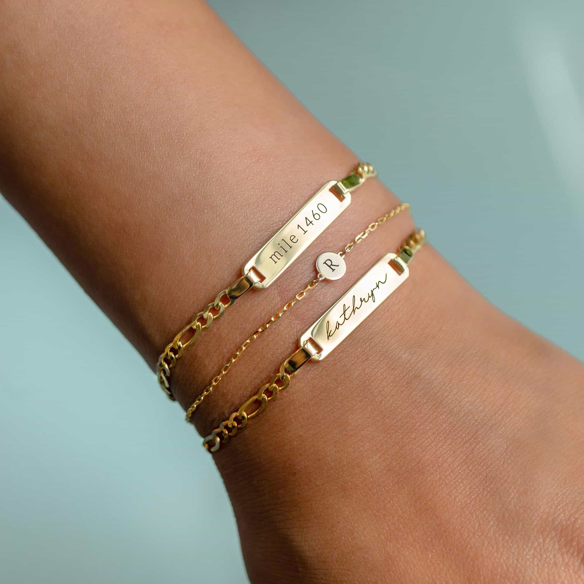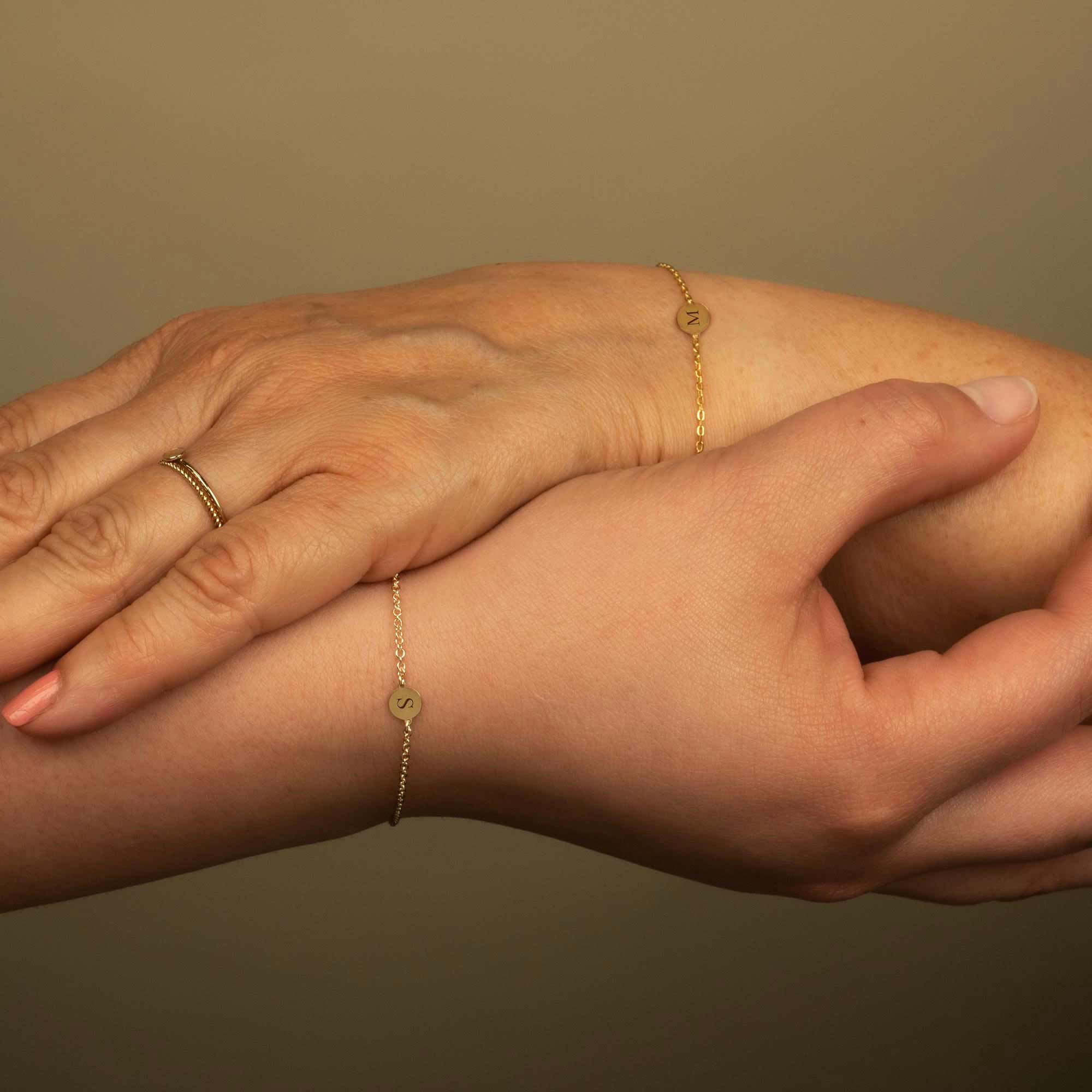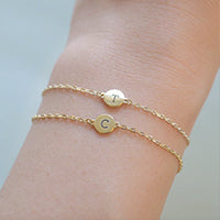 Dainty gold engraved disc bracelet on a delicate chain. Elegant and timeless, this personalized piece makes a meaningful gift. Handmade in NYC.