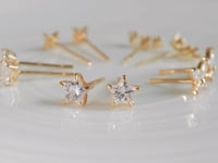 Dainty solid gold star stud earrings with tiny crystal detail, perfect for second or third piercings and stacking in your ear set.