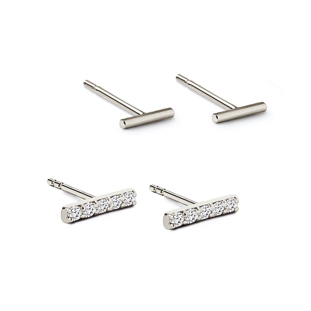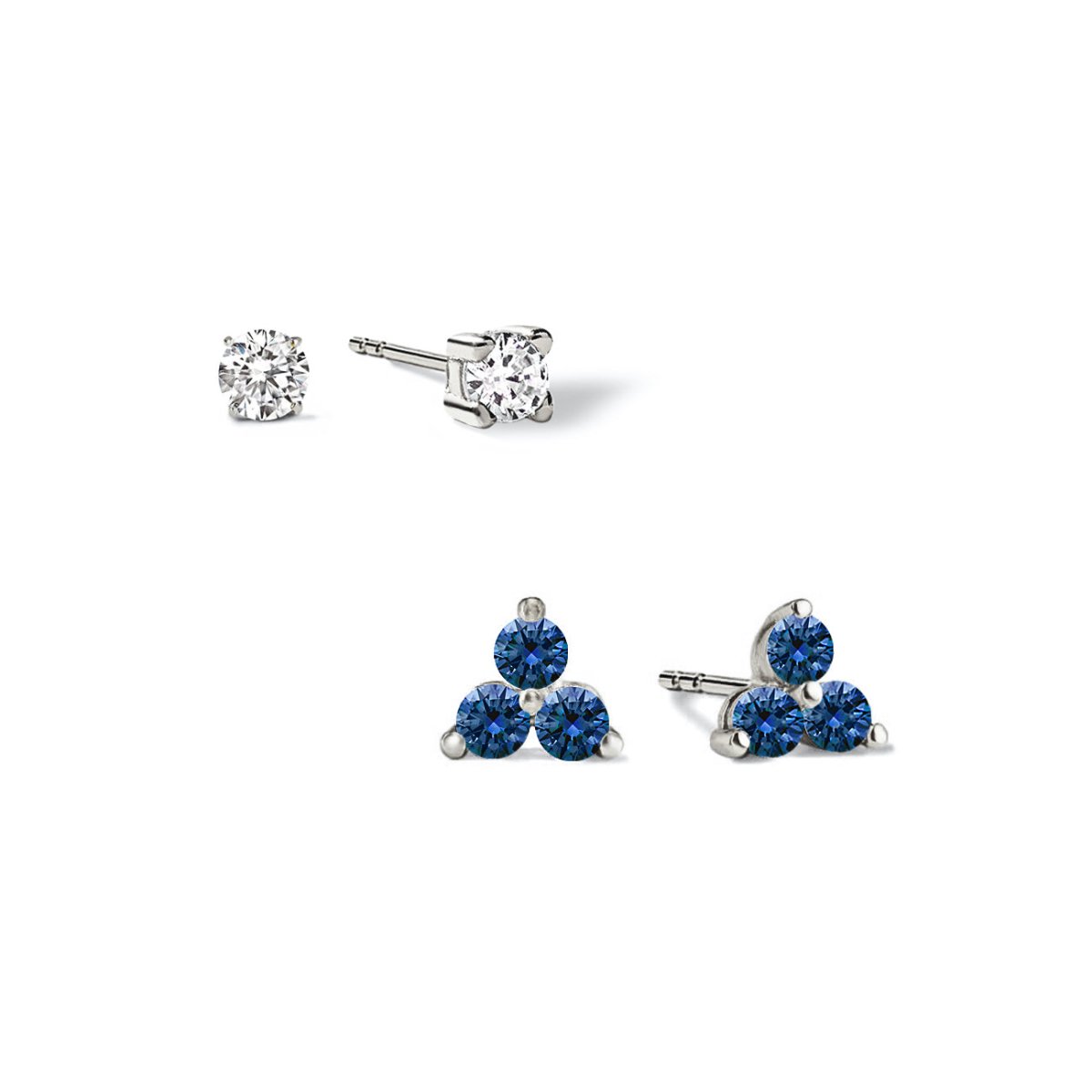 Dainty silver earrings set. Tiny crystal studs paired with our clover studs set with Blue Sapphire stones. Perfect for second, third, or cartilage piercings.