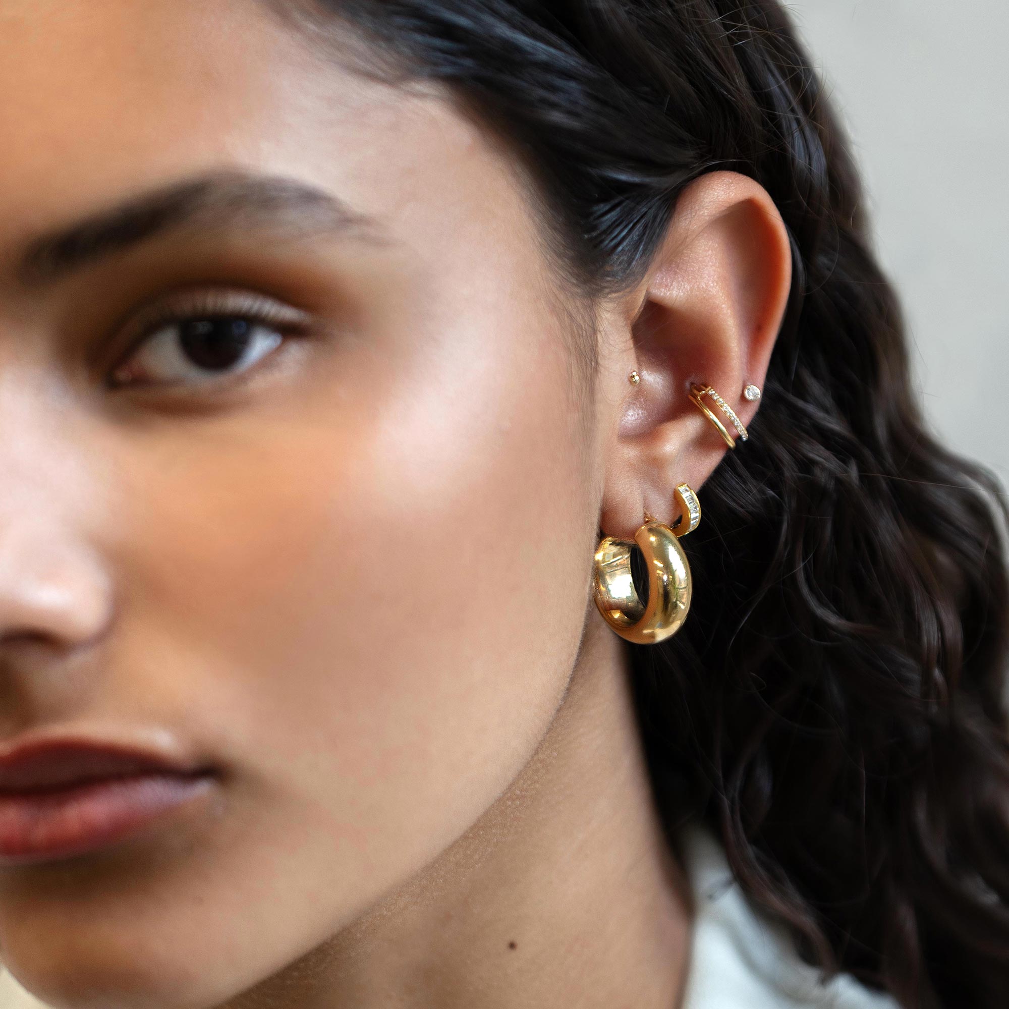 Thick chunky 14K Gold hoops that create a bold statement look. Lightweight and comfortable to wear all day. The latch feature makes it easy to put on and take off.