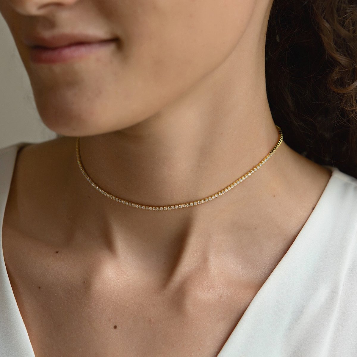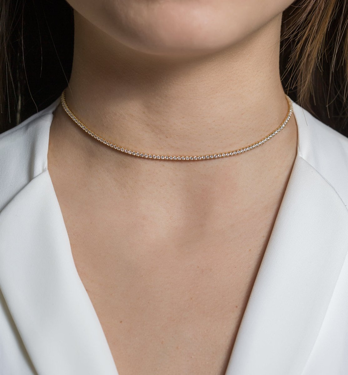Glow in our ultra-fine gold cubic zirconia choker necklace, a radiant chain that elevates any look. Perfect worn alone or layered for effortless elegance.