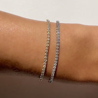 This thin single line Silver tennis bracelet features tiny cubic zirconia crystals that sparkle at every angle. Won't snag on dress, adjustable sizing, lightweight and easy to wear.