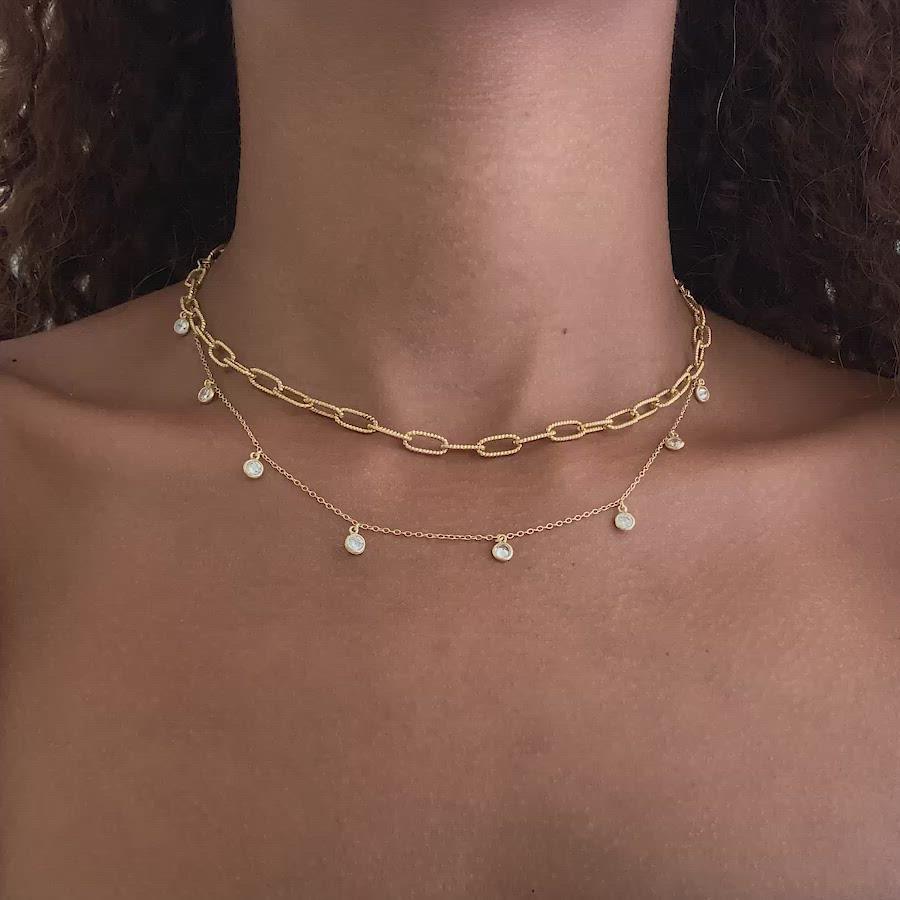 This sparkly dainty choker from our signature O Collection, features hanging bezel set crystals on a delicate Rolo chain. Pair it with other necklaces from this collection. Our patented connectors let you easily link and layer necklaces in any order you desire.