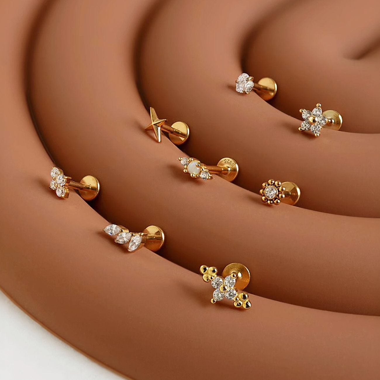 This teeny tiny curved crystal trio flat back earring is made with Gold Titanium. Comfort fit for 24/7 everyday wear. Hypoallergenic, Wear on upper-lobe, conch and helix piercings.