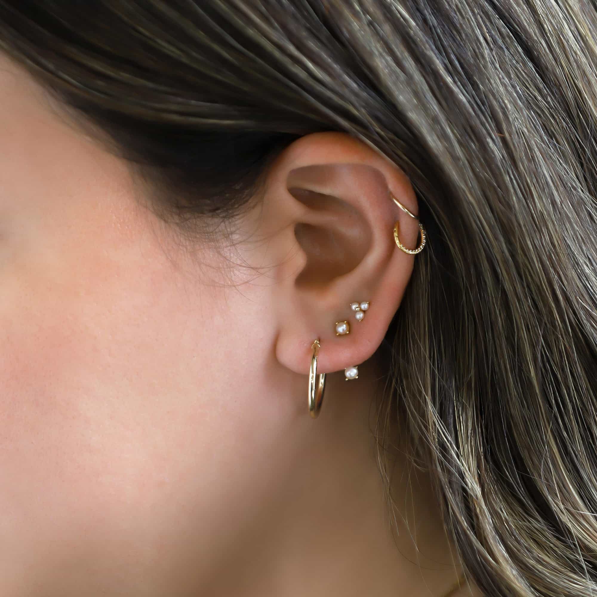 Medium sized hoops that are light-weight and perfect to wear for your everyday look. These Gold hoops are a staple piece that can easily stack with other huggies. The latch feature makes it easy to put on and take off. Great to pair with smaller Huggies.