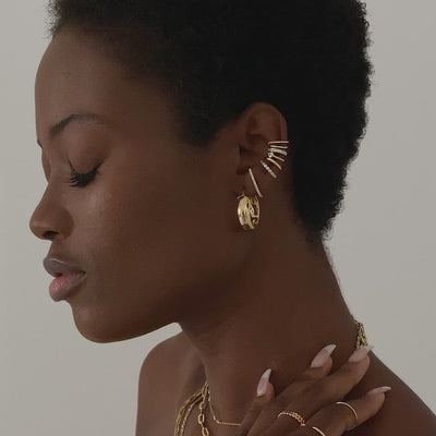 These gold earrings feature a curved pavé design that sit like studs but hug like huggies. A sleek addition to any ear stack. Seen on NYMAG: The Strategist.